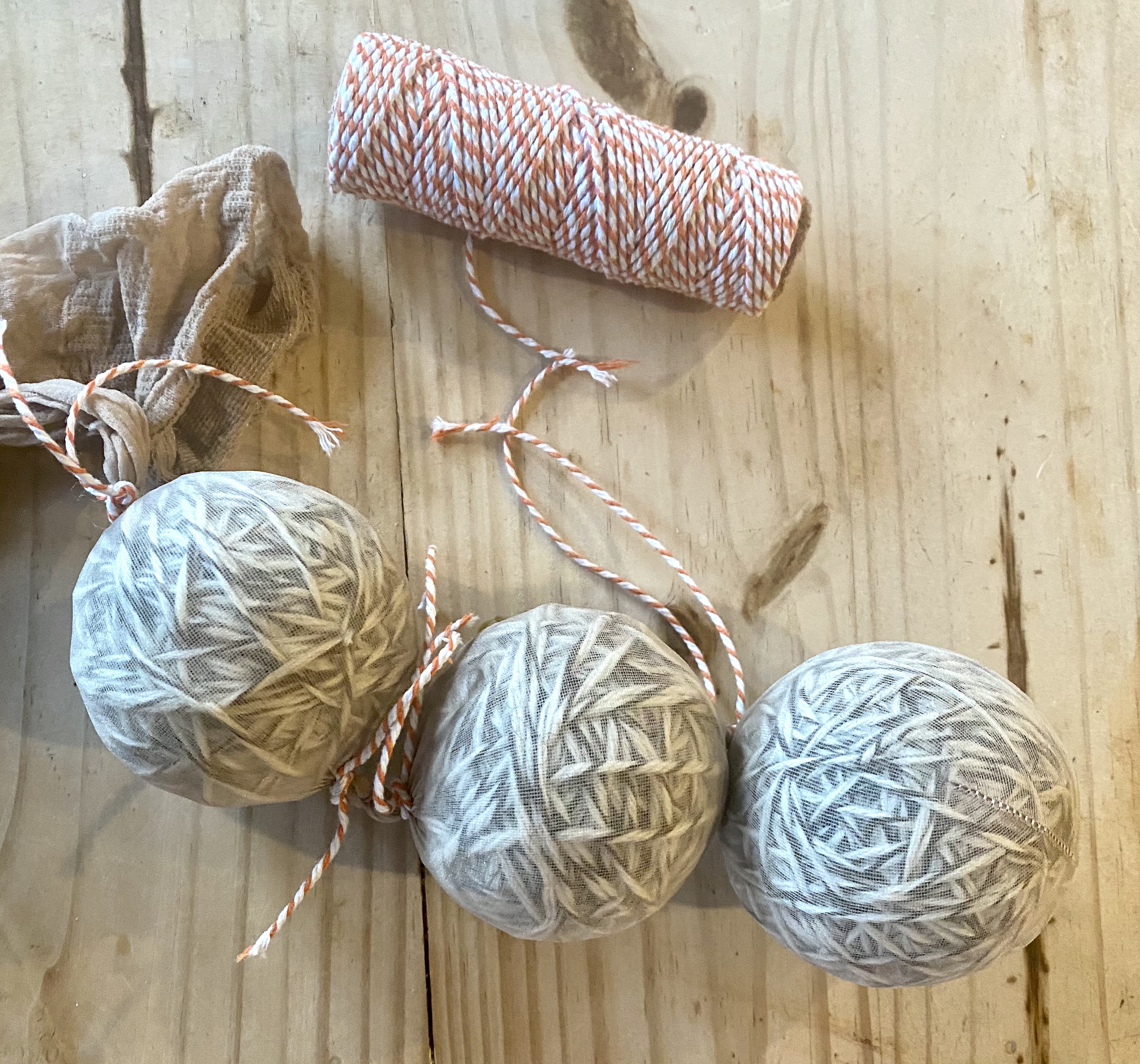 Once you have your 100% wool yarn, you will also need an old nylon stocking, string, scissors, and your favorite essential oils (