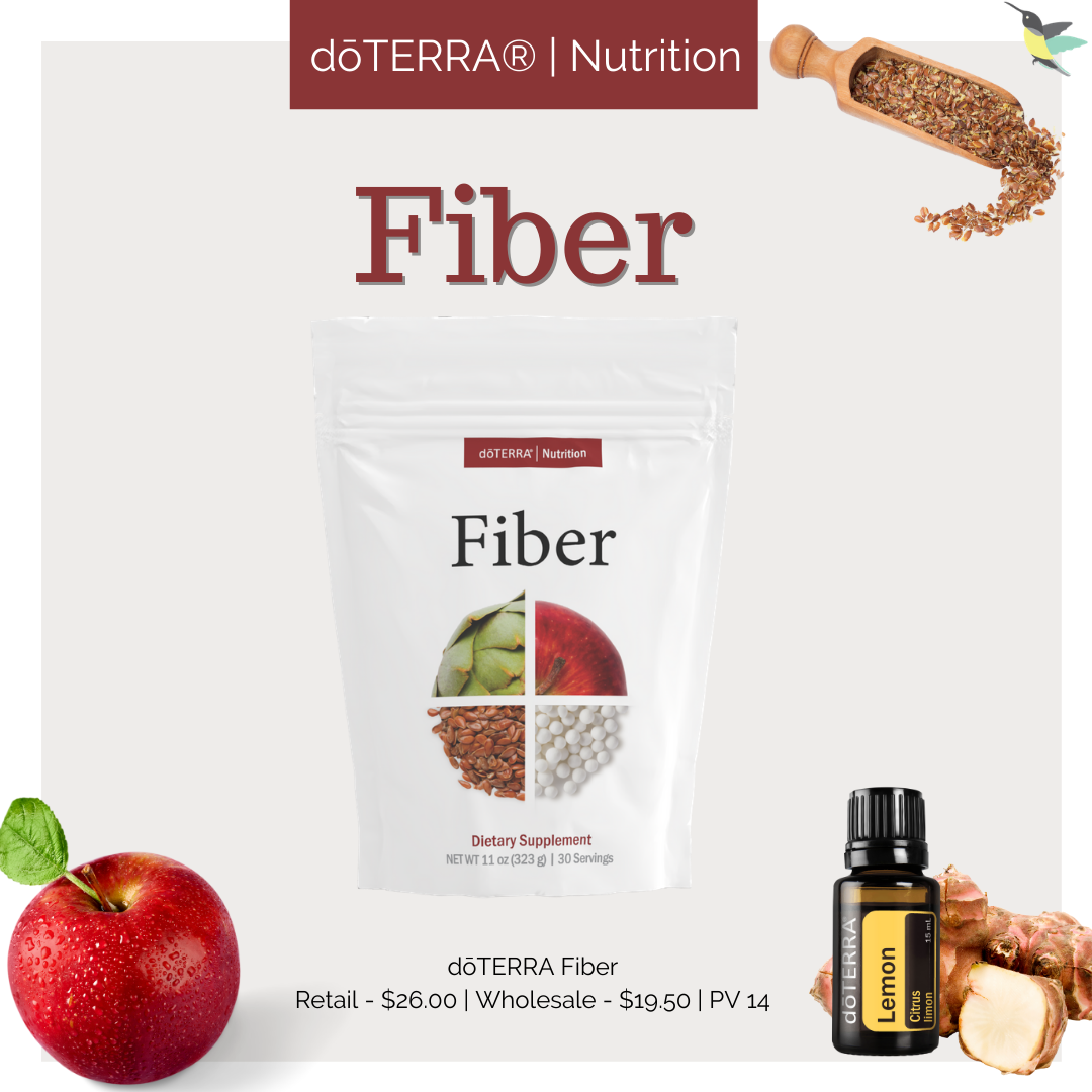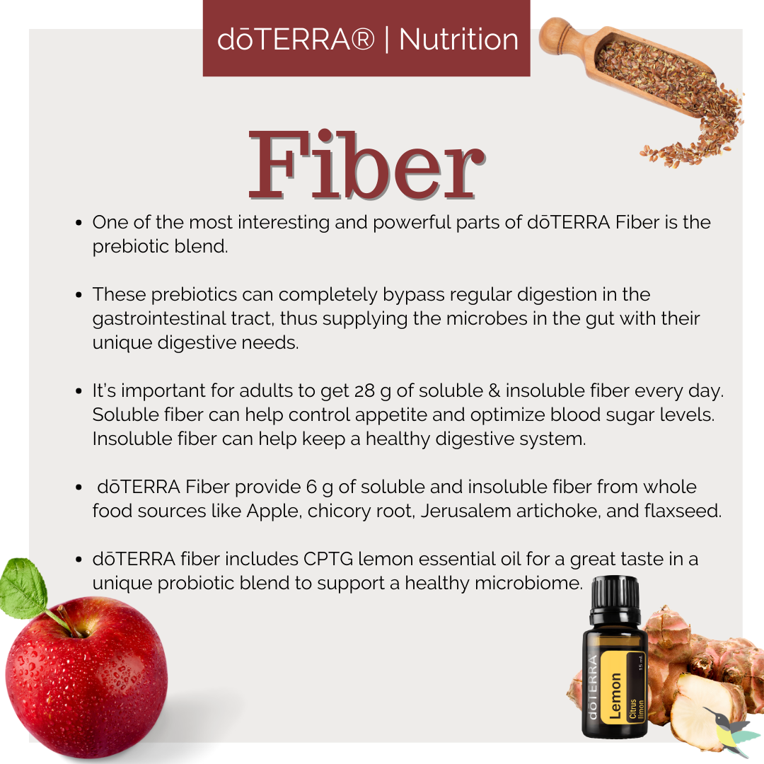 “dōTERRA Fiber is sourced from whole food sources like apple, tapioca, and flax seed to support a healthy and regular digestive system, control appetite, and support the metabolic process.