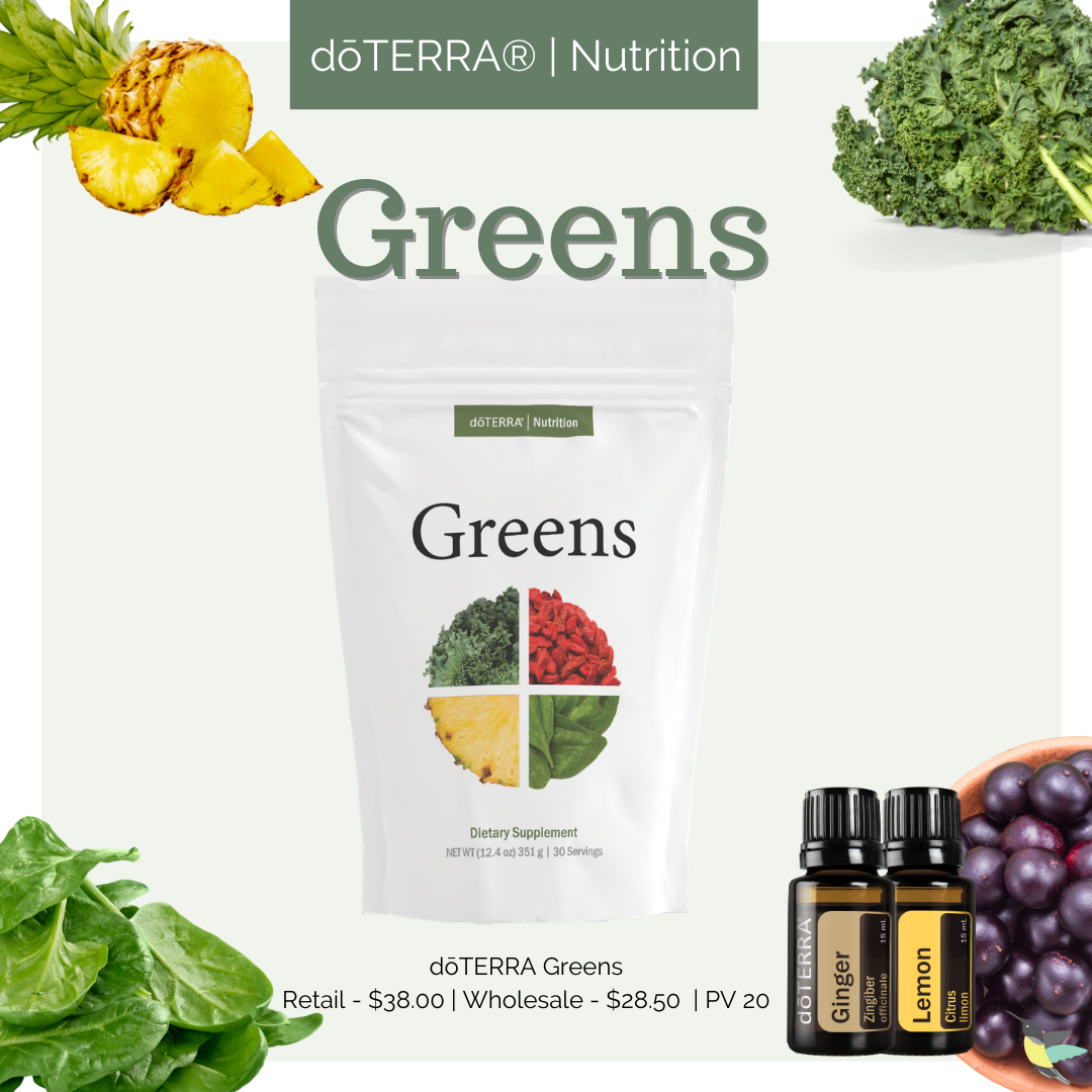 “With pure, plant-sourced, and nourishing ingredients, doTERRA Greens supports healthy immune function, digestion, weight management, and energy.