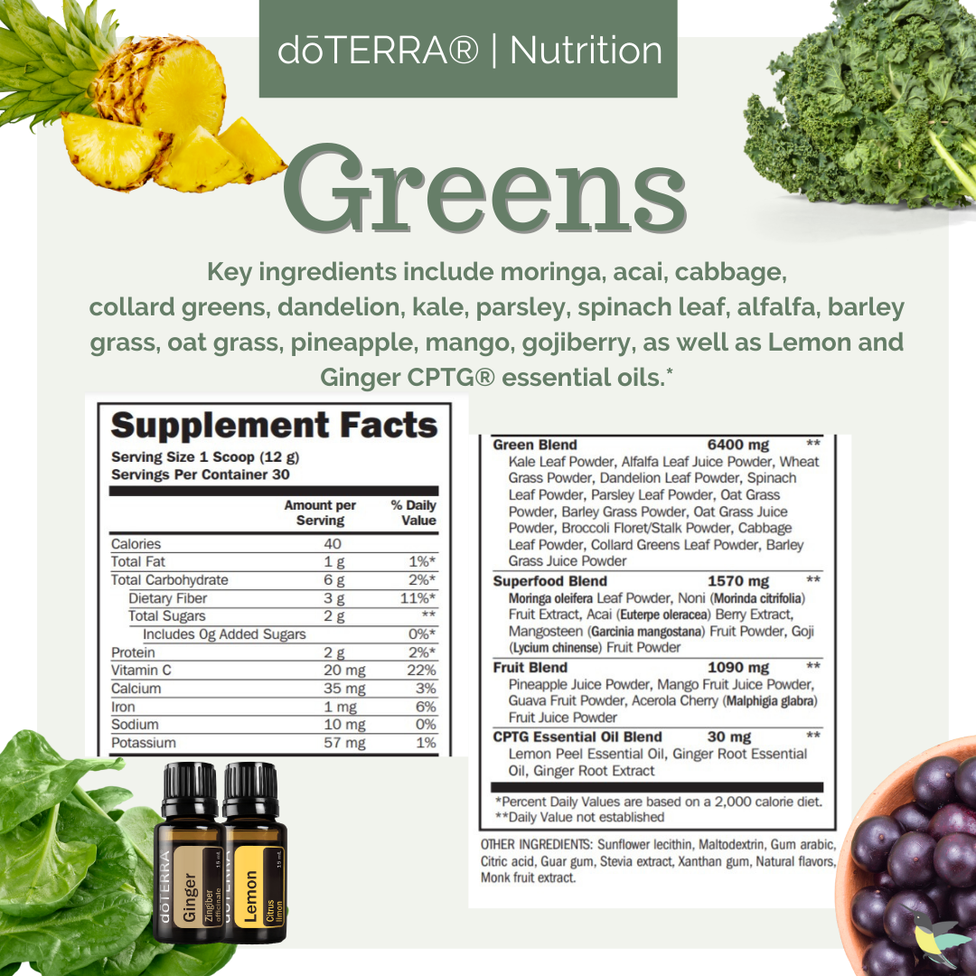 dōTERRA Greens is designed to supplement, not replace, your fruit and vegetable consumption. As with all dōTERRA products the ingredients are wholesome and responsibly sourced.