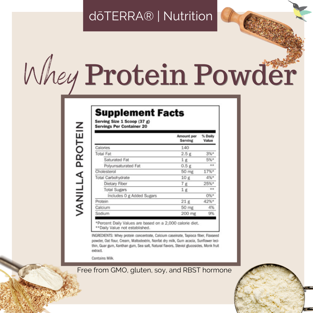 “dōTERRA Whey Protein provides 21 grams of a premium protein blend, from pasture-fed cows, to help you reach the recommended dietary allowance of protein and keep your body functioning at optimal capacity.