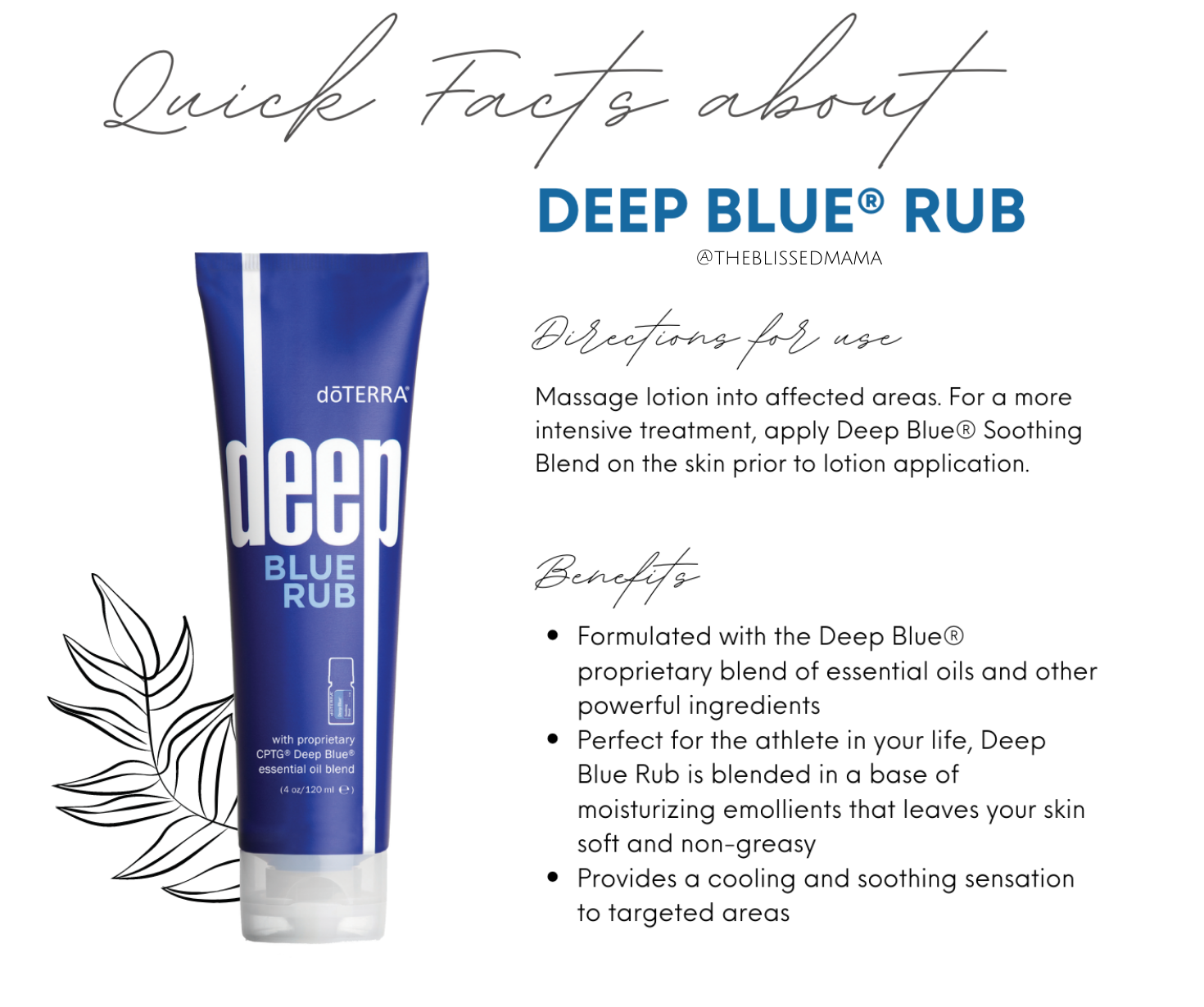 - Perfect for the athlete in your life, Deep Blue Rub is blended in a base of moisturizing emollients that leaves your skin soft and non-greasy