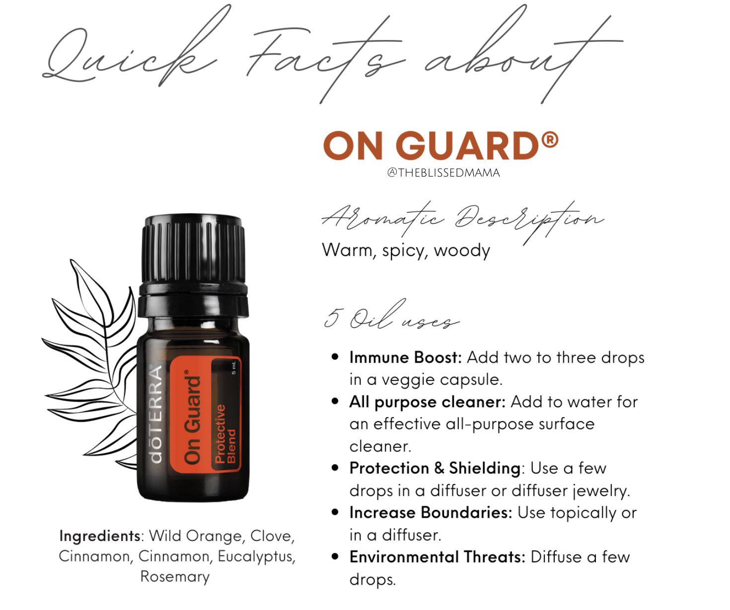 On Guard is a proprietary blend from doTERRA and is known as doTERRA’s Protective Blend. This is one of doTERRA’s most popular oils, it is a proprietary blend that supports healthy immune function with used internally and contains cleansing properties.