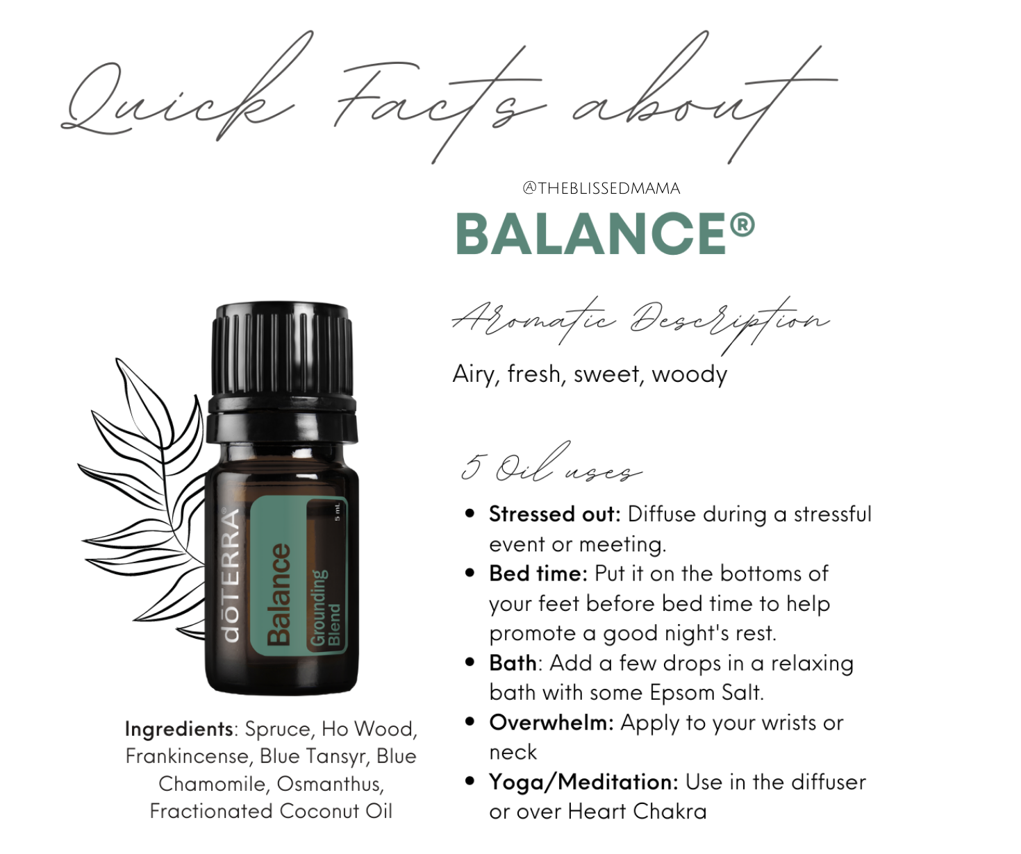 Balance, also known as doTERRA’s Grounding Blend, is a proprietary blend appropriately named balance, because it offers a tranquil aroma. It can assist in bringing harmony to the mind and body and helps to balance out the emotions. This oil is a great for anxious feelings and it is also great for supporting homeostasis in the body.