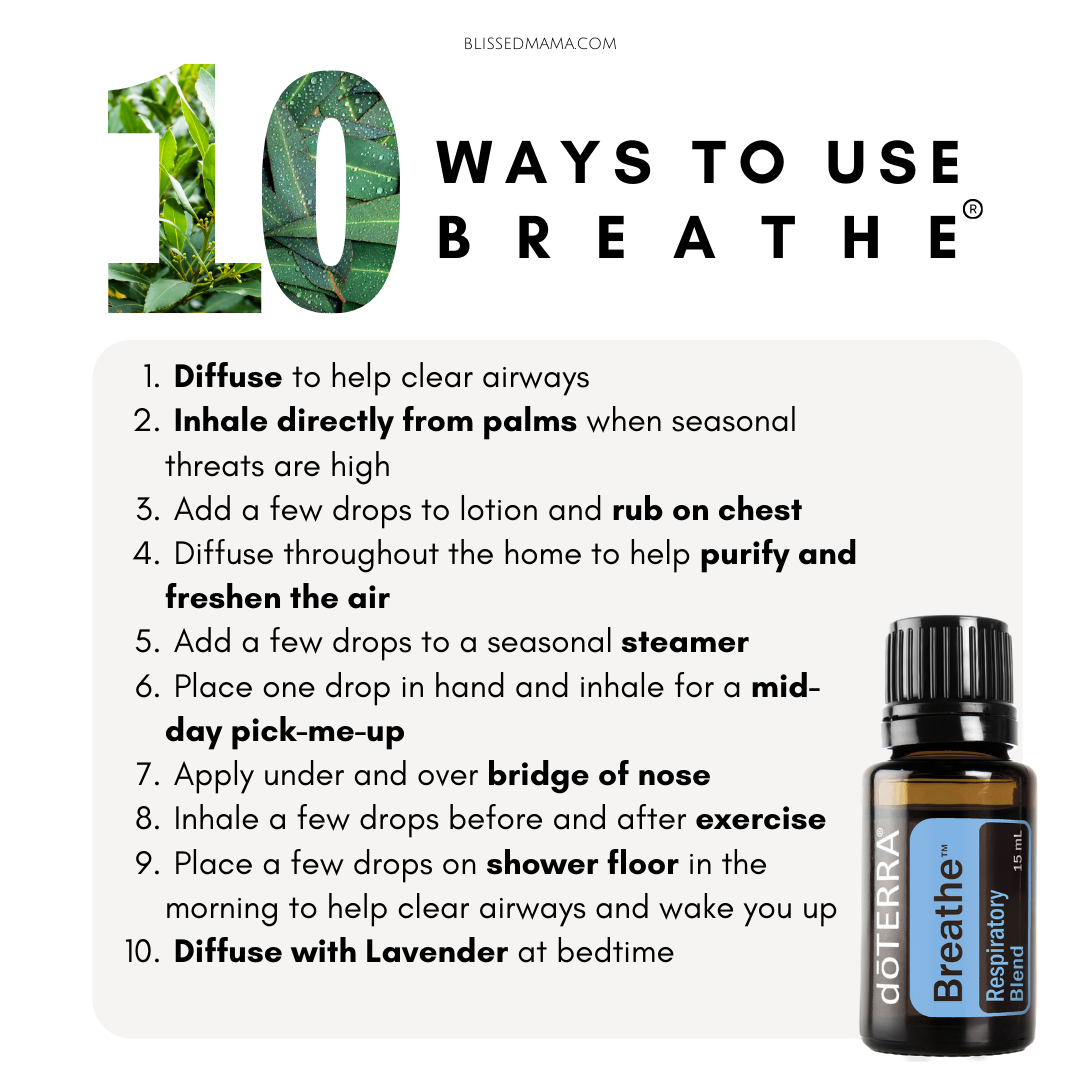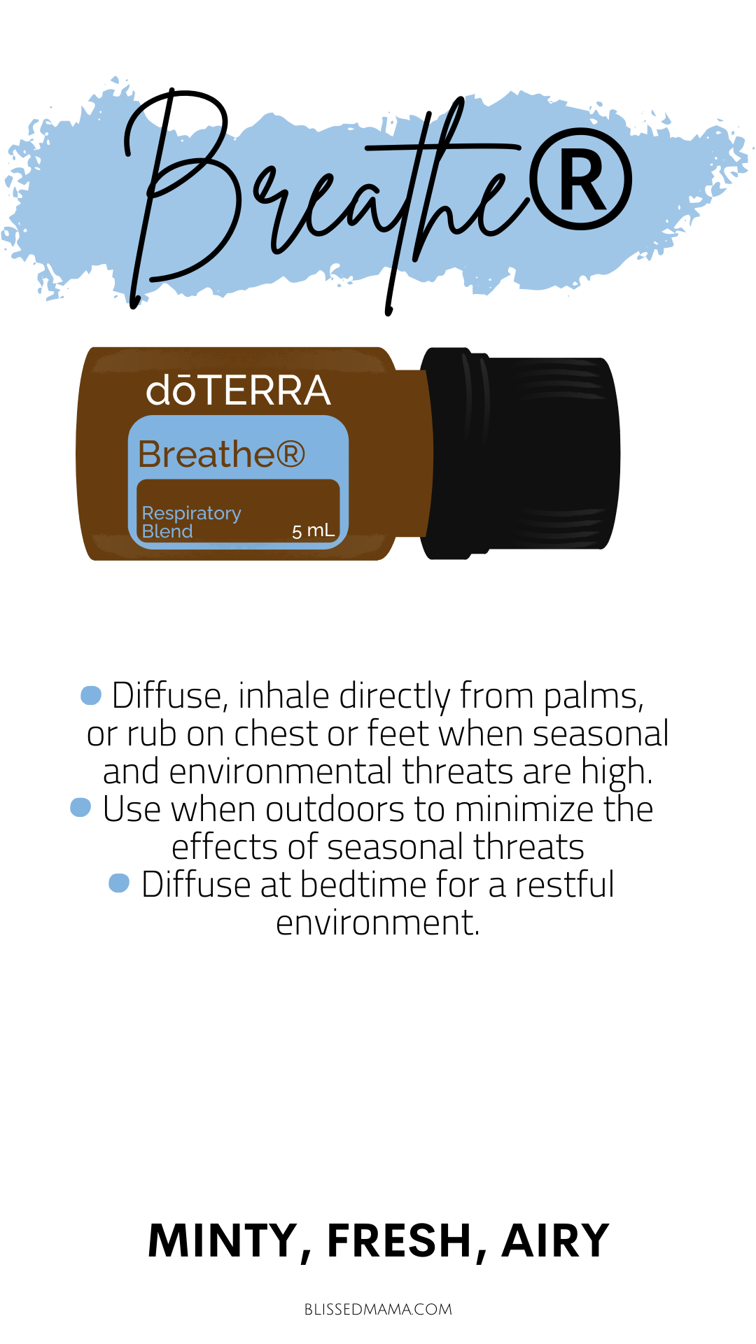 Breathe is doTERRA’s respiratory blend. This powerful blend is great for promoting or maintaining the feeling of clear airways and easy breathing. Breathe can be applied topically to the chest, back, and bottoms of the feet at night to promote restful sleep. It can also be diffused to reduce seasonal or environmental threats.