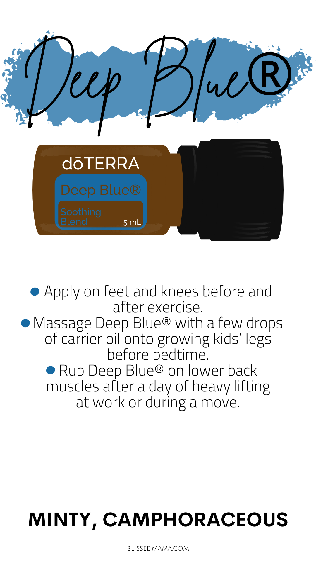 Deep Blue is doTERRA’s soothing blend. Deep Blue is a great essential oil to use for occasional physical discomfort. It can be used to soothe sore muscles after a workout or just a long day at work. It can be applied to knees and feet before and after a workout. Dilute it with a carrier oil and massage it into growing kids’ legs before bedtime. Use on lower back muscles to soothe discomfort.