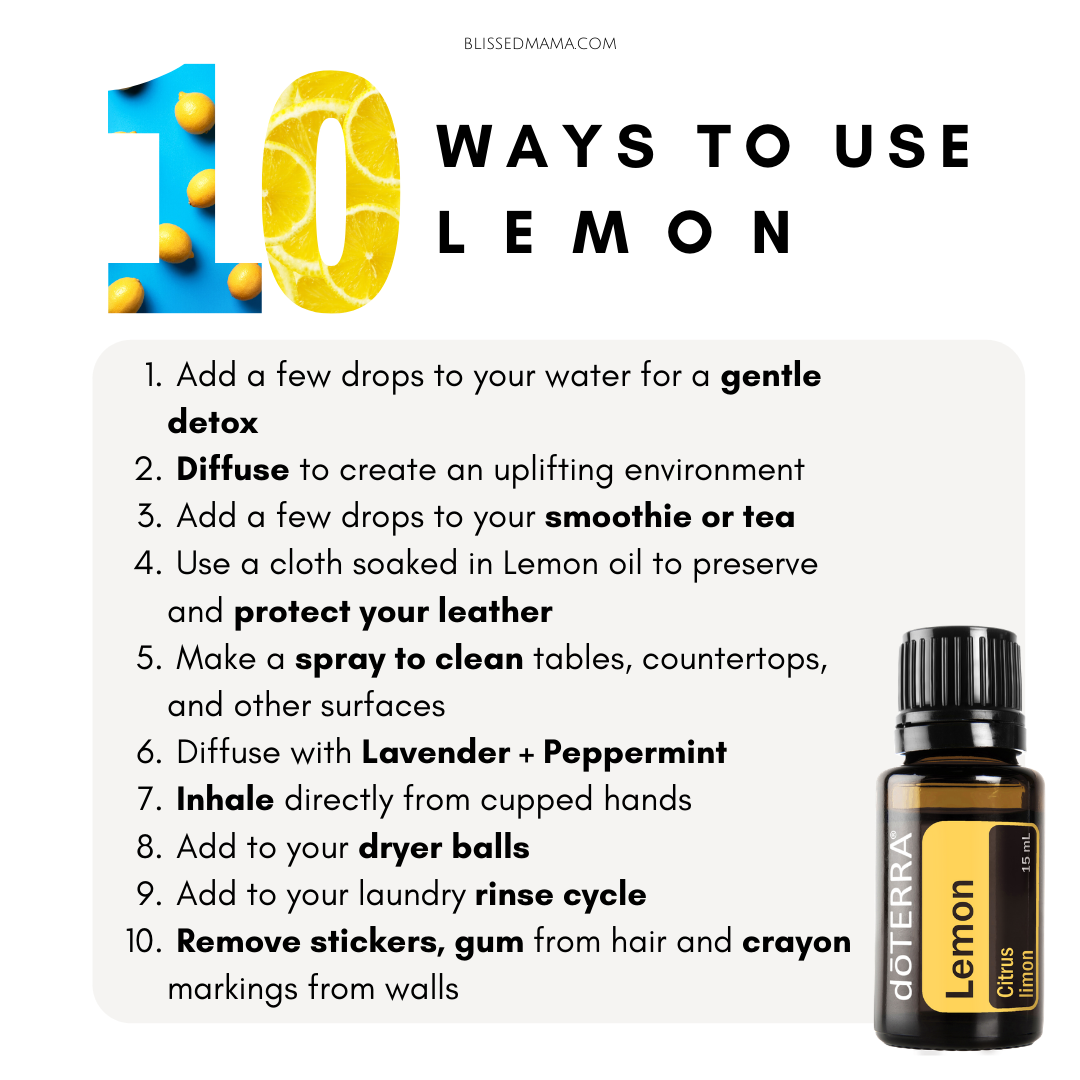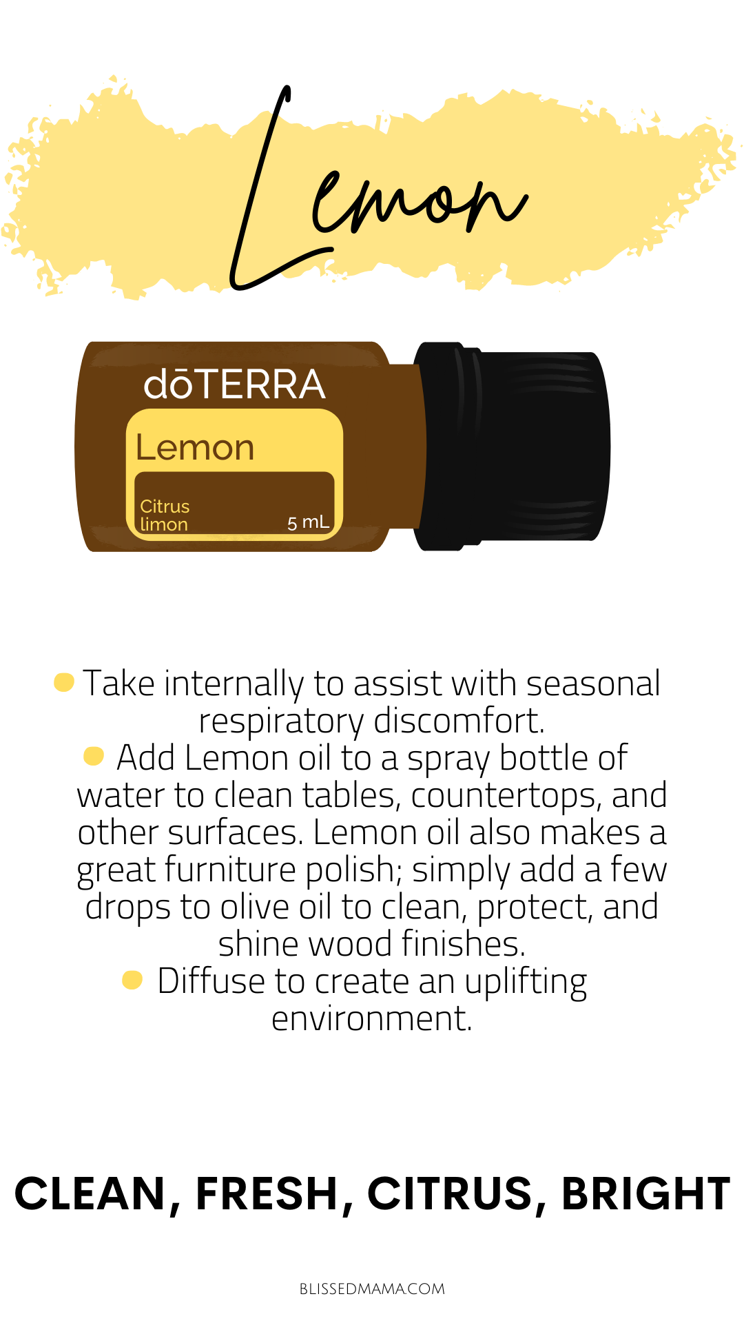 Lemon essential oil is a top selling oil among doTERRA customers. It has cleansing, purifying, and invigorating properties. Lemon essential oil can be diffused to purify the air and for an instant mood booster. Add a couple drops to your water for a healthy boost throughout the day. It can also be added to water and placed in a spray bottle to clean countertops and other surfaces in your home. If you have leather furniture in your home, soak a cloth in Lemon oil and wipe down leather surfaces to preserve them or use Lemon oil on silver and other metals to combat the early stages of tarnish.