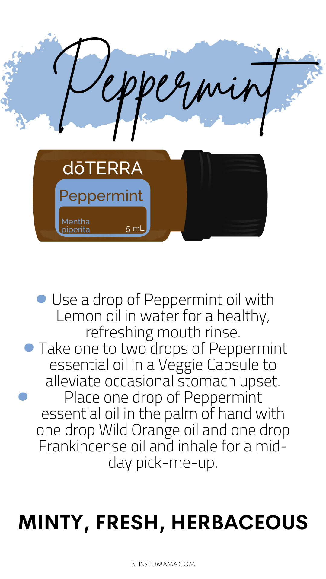 Peppermint is another best-selling oil among doTERRA customers. Peppermint oil can help to alleviate occasional stomach upset and promotes healthy respiratory function when used internally. Create a mouth wash with Peppermint oil by adding a drop of Peppermint oil and a drop of Lemon oil to water. Add a drop or two of peppermint oil to a veggies capsule to alleviate stomach upset. For a mid-day pick me up, place one drop of Peppermint oil and one drop of Wild Orange oil in your hand and inhale deeply.