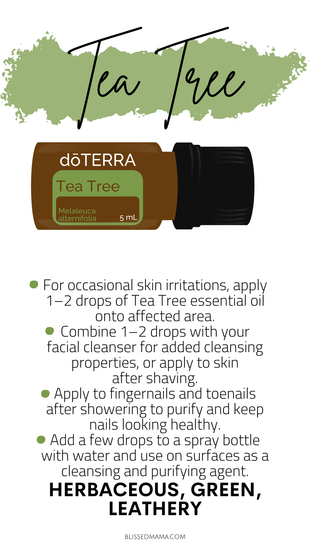 Tea Tree essential oil is best known for its purifying properties. Tea Tree oil can be used to cleanse the skin, clean surfaces in the home, and purify the air. It can be applied to the skin after shaving or to the fingernails and toenails after showering to keep them looking healthy. It can also be added to water and a spray bottle to clean surfaces in your home.
