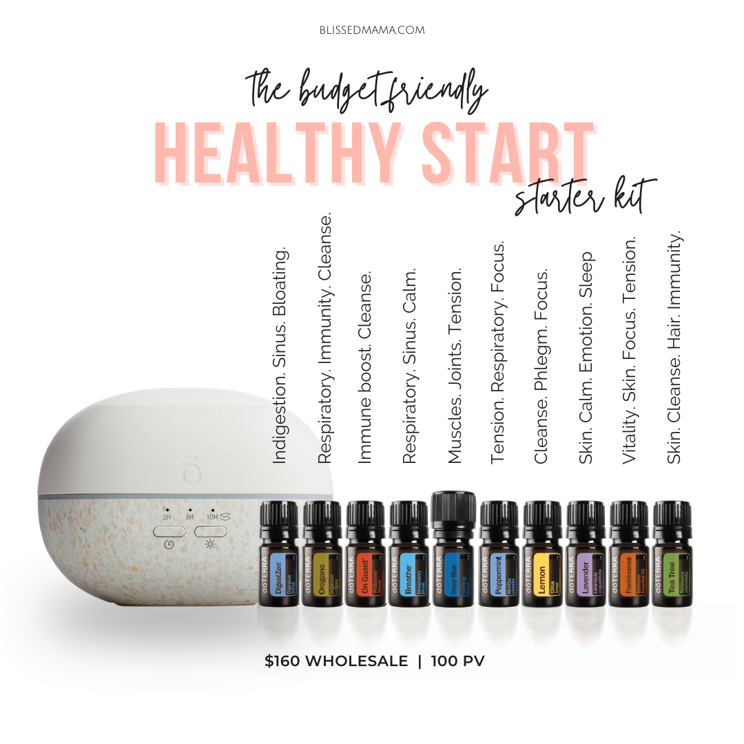 The Healthy Start Enrollment Kit comes with 10 pure essential oils and blends, as well as the Pebble Diffuser. This is a great kit to get started with when beginning to use essential oils. Many new people start with this kit and love it. The oils included in this kit are some of doTERRA’s best-selling and most versatile oils.