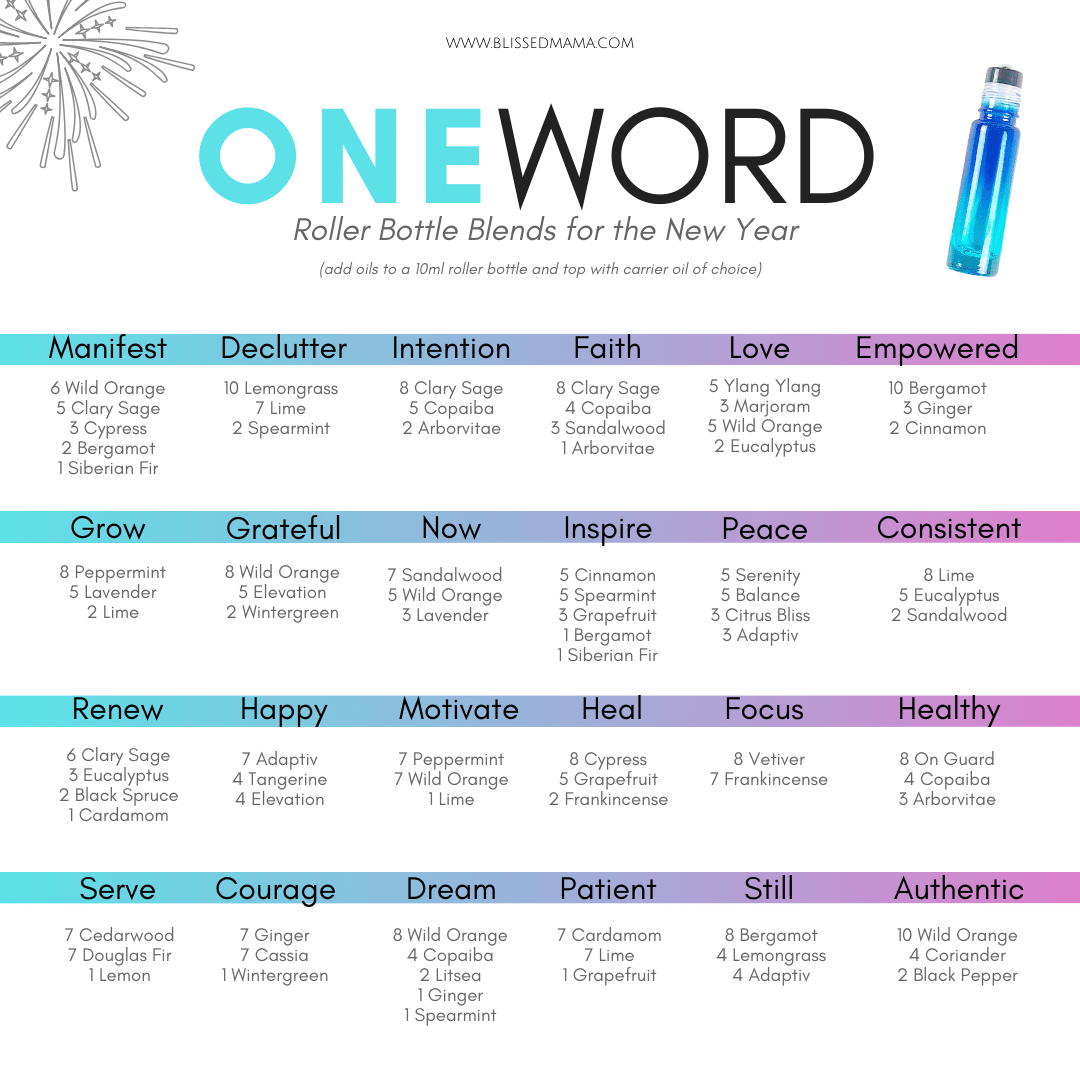 The idea is to pick a word that will be your theme for the year and whenever you start to feel like you are losing your track, you can go back to that one word. I want you to take it a step further though and create a custom blend of essential oils to go with your word. The cool thing about custom blends is that you don’t normally smell them often, so whenever you do smell that blend your brain will associate the aroma with your word of the year. Check out some of the custom blend recipes below, you can use those or you can create your own.