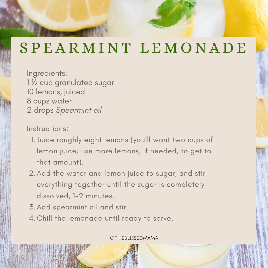 Juice roughly eight lemons (you’ll want two cups of lemon juice; use more lemons, if needed, to get to that amount). Add the water and lemon juice to sugar and stir everything together until the sugar is completely dissolved, 1-2 minutes. Add spearmint oil and stir. Chill the lemonade until ready to serve.