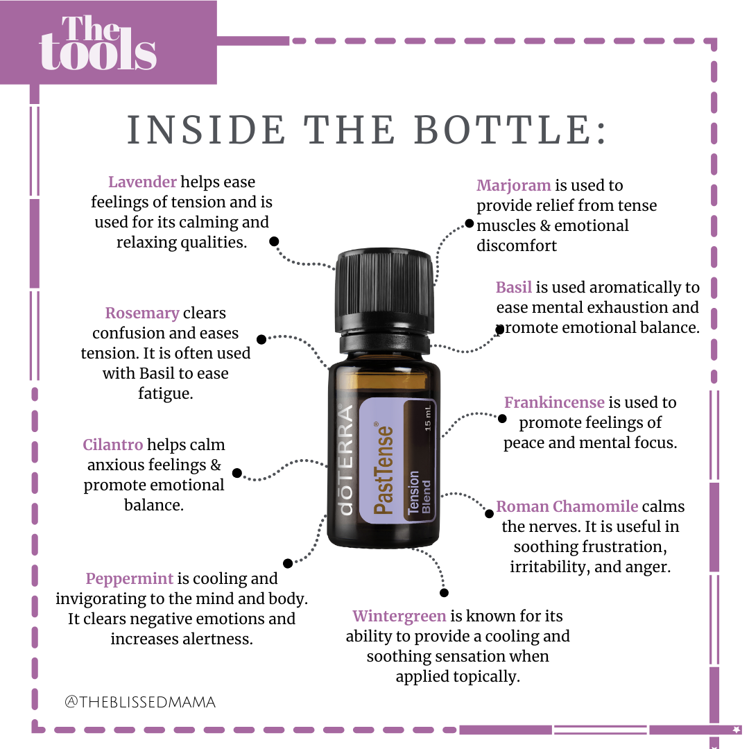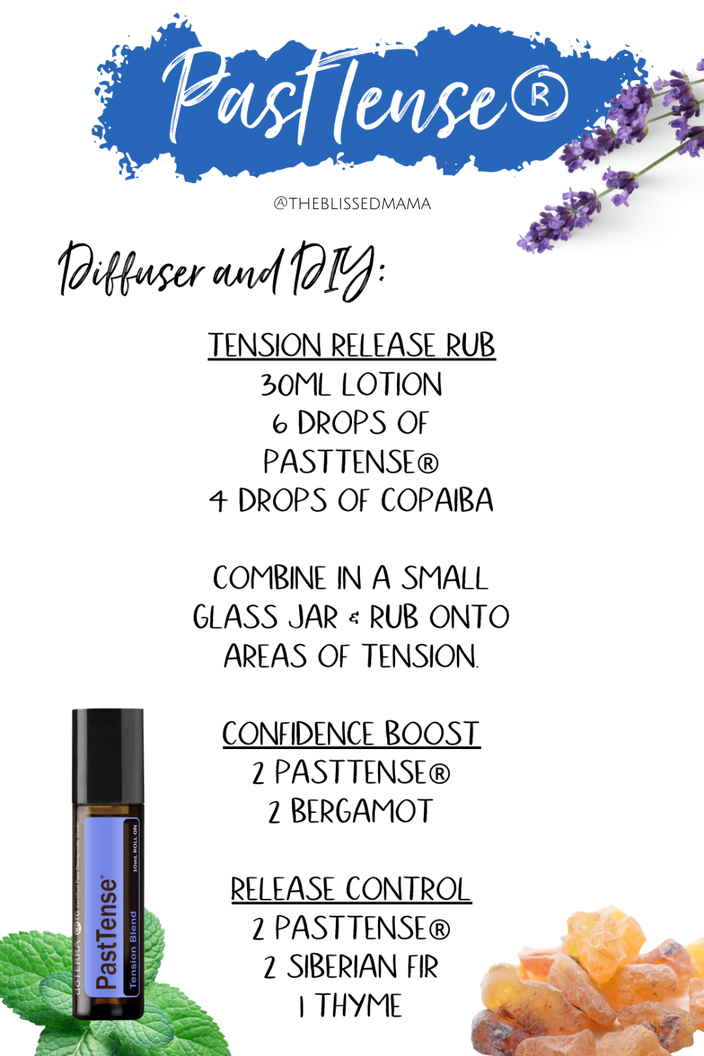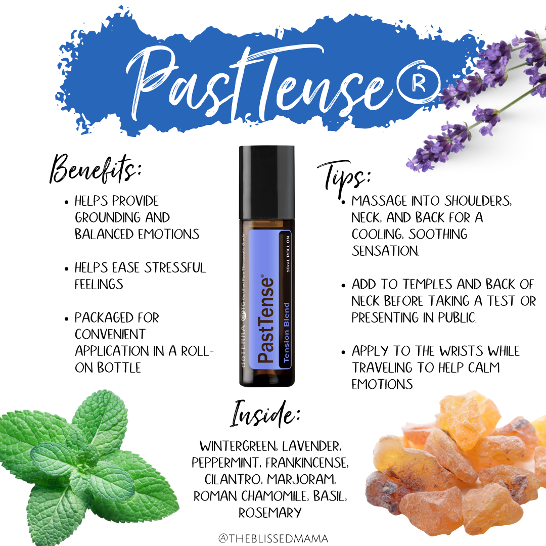 Past Tense is a proprietary blend of Wintergreen, Lavender, Peppermint, Frankincense, Cilantro, Marjoram, Roman Chamomile, Basil, and Rosemary. This oil is tension relieving and has a calming aroma. You can rub it directly on tense muscle spots or rub it on the back of your neck. It can also be used around the hairline for occasional head tension.