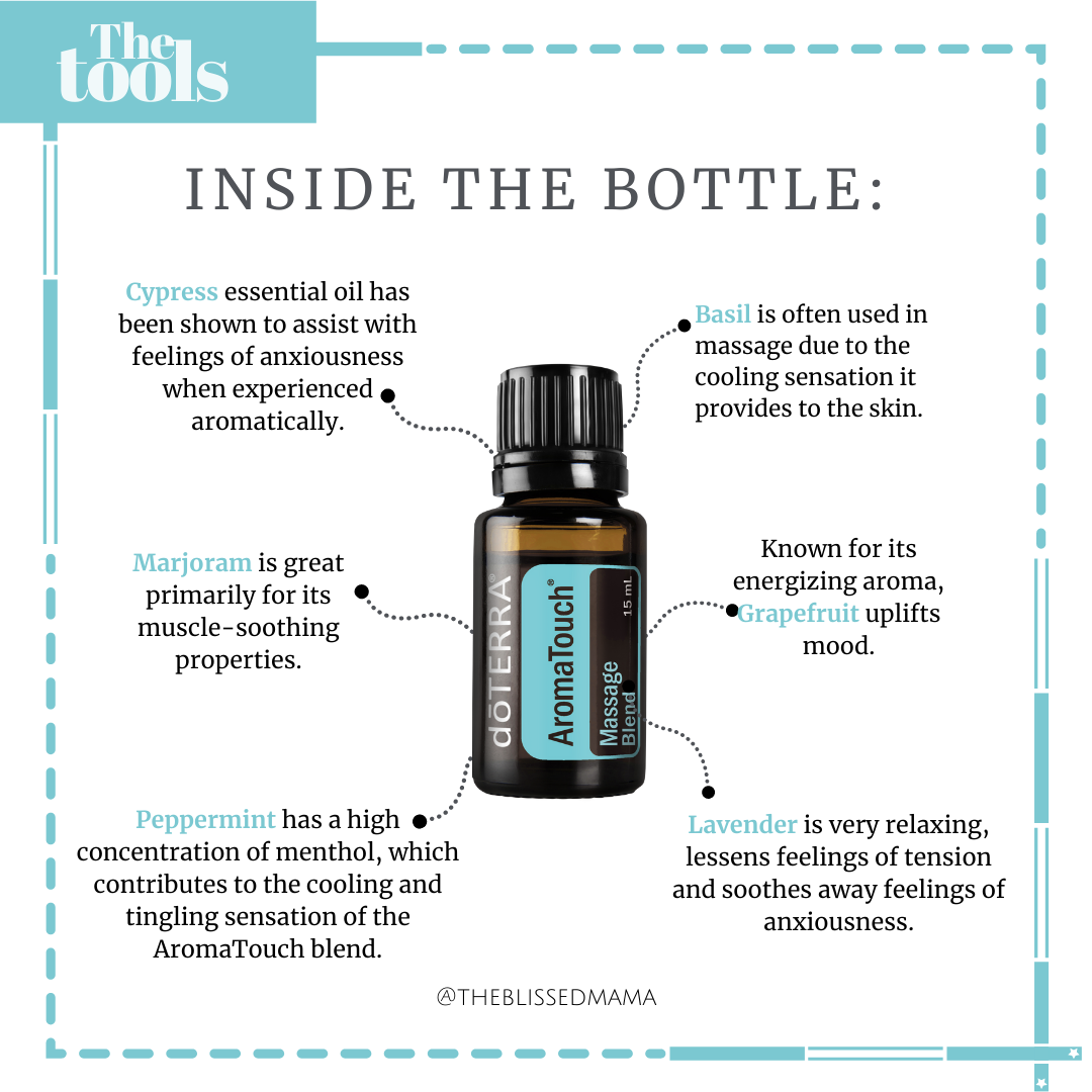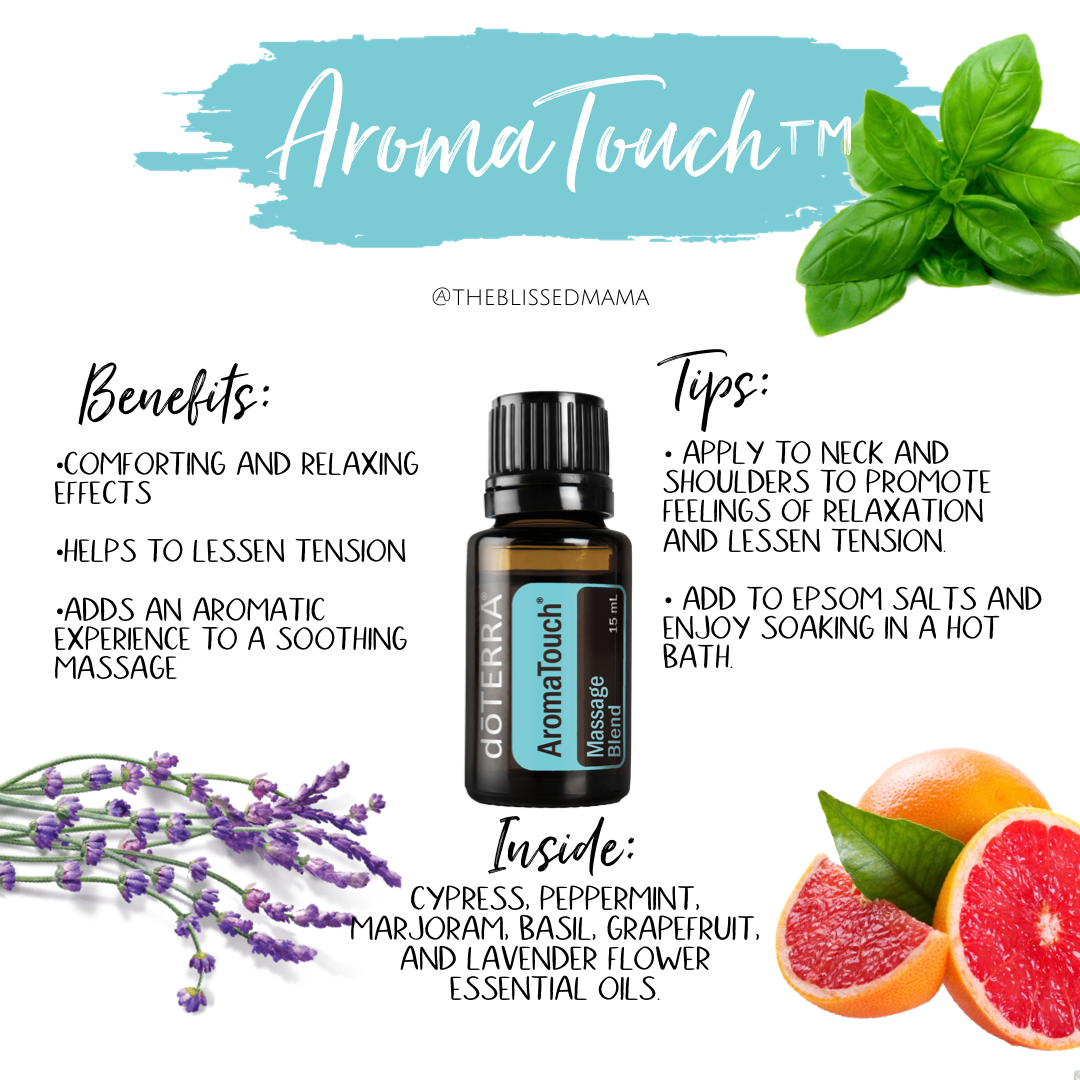 AromaTouch Essential Oil is another doTERRA proprietary blend of Cypress Leaf, Peppermint Plant, Marjoram Leaf, Basil Leaf, Grapefruit Peel, Lavender Flower essential oils. This oil is coined as doTERRA's massage blend. AromaTouch can be used during a massage for a whole body wellness experience. It is also great for soothing those tense muscles in your neck and shoulders. You can apply the oil directly to your neck and shoulders or you can make a blend of AromaTouch and Lemongrass, check out the recipe below.