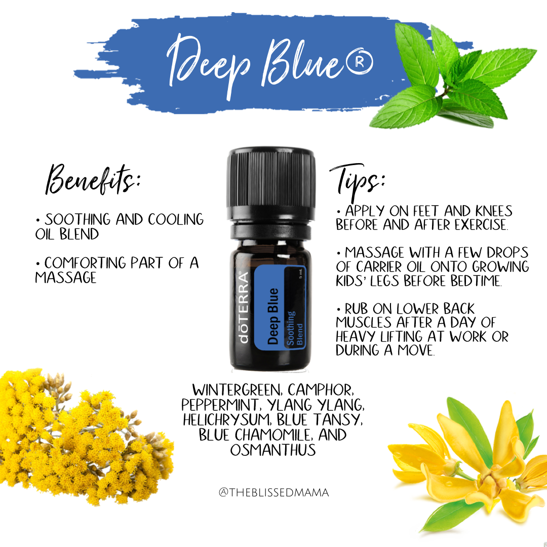 Deep Blue Essential Oil is another proprietary blend of Wintergreen, Camphor, Peppermint, Ylang Ylang, Helichrysum, Blue Tansy, Blue Chamomile, and Osmanthus. Deep Blue products are the among doTERRA's top selling products. You can rub Deep Blue on to the back of your neck after a long day of sitting at your computer or looking at your phone. Deep Blue will soothe and cool those tense muscles in the neck and shoulders.