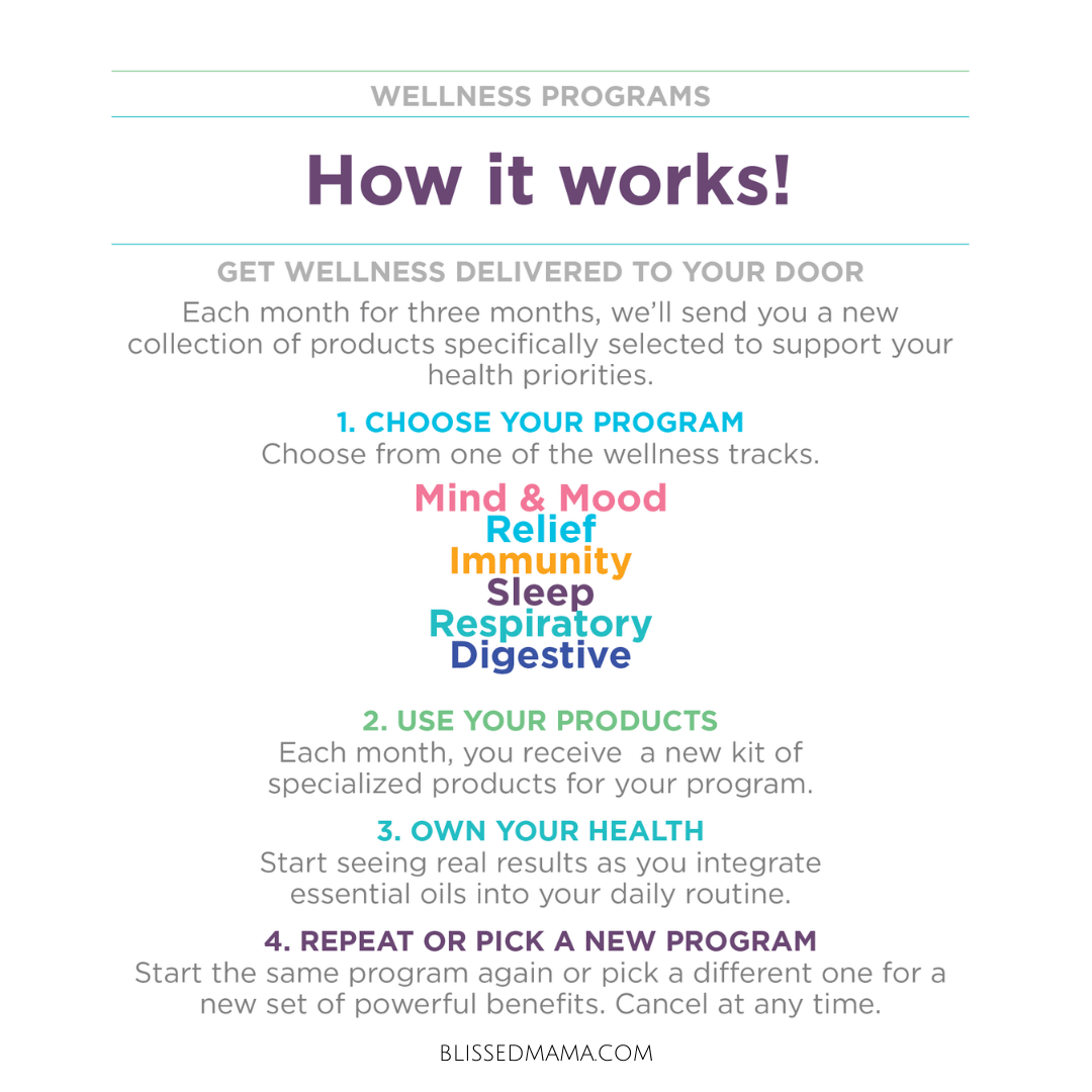 doTERRA created Wellness Programs to meet the needs of certain areas of health that customers may be struggling with. These are three-month subscription boxes that are delivered each month for three months and contain products that are specifically designed to target your wellness goals.