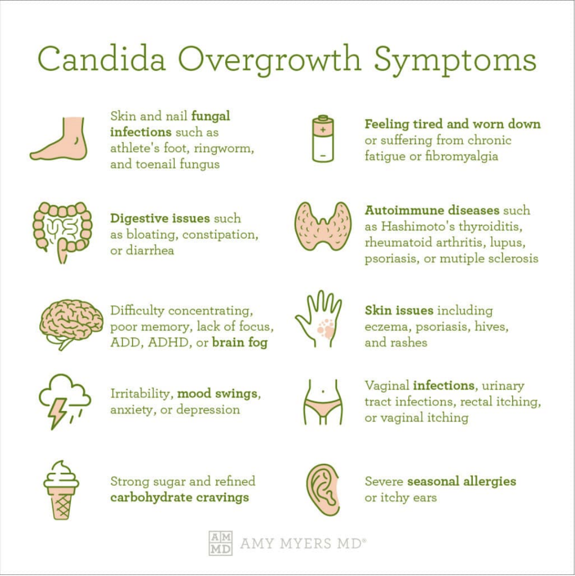 Candidiasis, or yeast overgrowth, is very common and causes Candida overgrowth symptoms such as bloating, constipation, rashes, fungal infections, fatigue, brain fog, a weakened immune system, and mood swings.