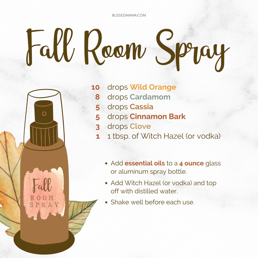 Note: If you don’t have Harvest Spice essential oil, you can find more room spray recipes below under DIY Ideas. A good tip is to try diffusing oils together before making a room spray to see if you will like the aroma or even making a room spray out of your favorite essential oil blend. I like to add about 40 drops of essential oils to a 4 oz spray bottle for reference.