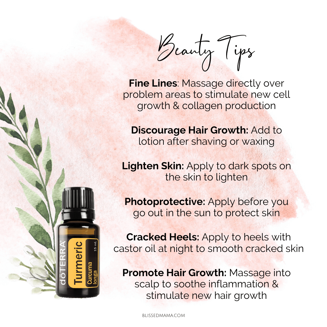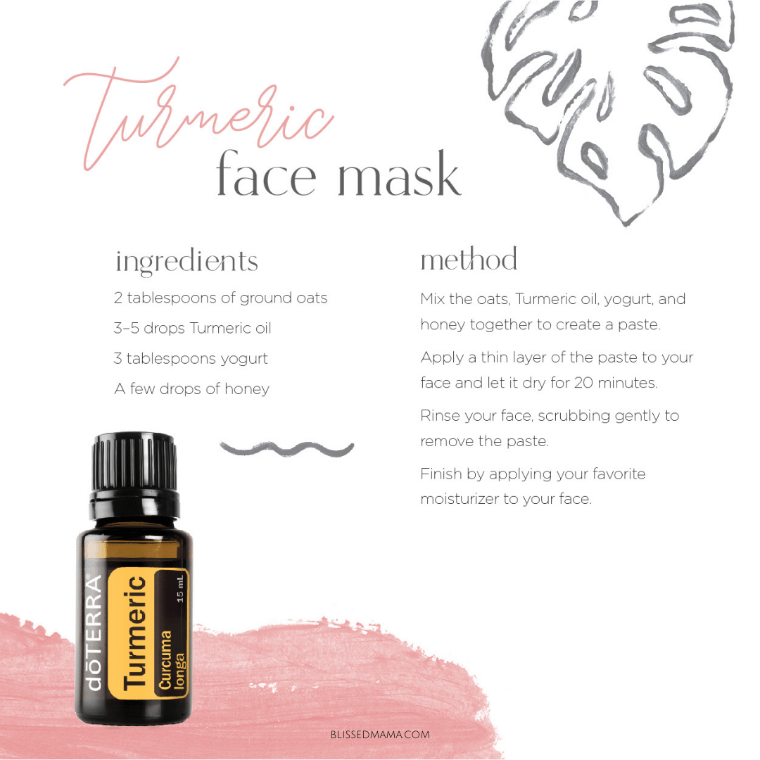 Some ways to use Turmeric in your skin care routine is by adding a couple drops of Turmeric Essential Oil to your favorite DIY face mask. One of my favorite face masks is by using a teaspoon of raw honey, adding a few drops of Turmeric oil, and then applying it to my face for ten minutes before washing it off. Honey is a natural humectant which means it is natural moisturizing. It might be counterintuitive to think about putting honey on a blemish, but it works well to clear up blemishes. The Turmeric has natural skin brightening properties as well.