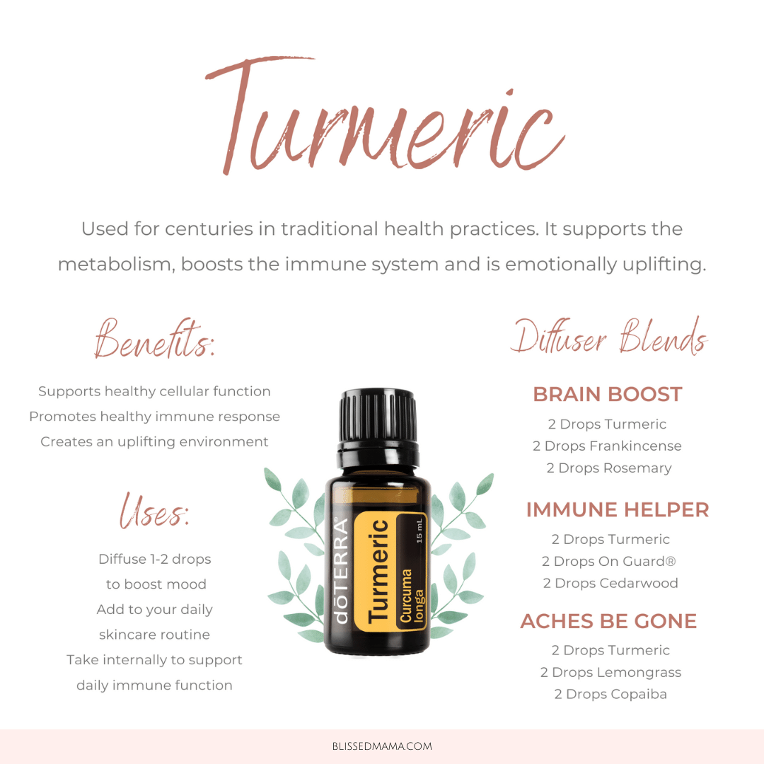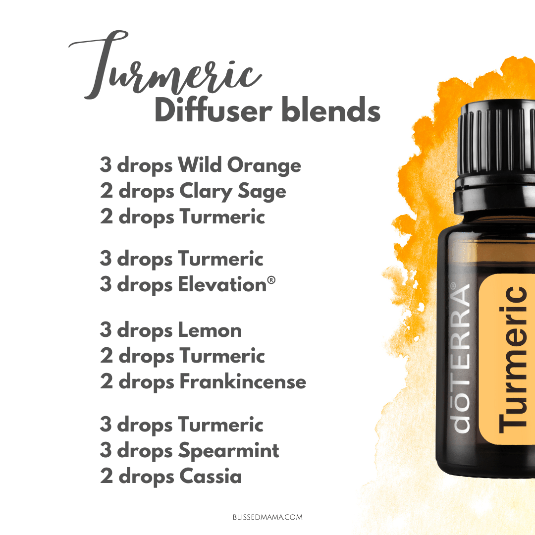 Turmeric can promote positive mood when inhaled, so think diffusing it or rubbing it on your hands and breathing it in. If you haven’t smelled Turmeric, it is earthy, grounding, and a little bit woody. Check out all the diffuser recipes below to get some ideas for diffuser blends, so that you can kick off your day in a positive mood.