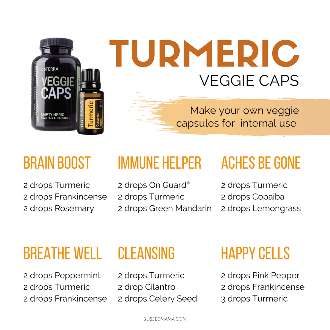 Another thing you can do is make your own capsules of Turmeric oil using doTERRA’s empty Veggie Caps and putting a few drops of Turmeric inside or even add Turmeric and other oils for added benefits. Check out the recipes below to get some ideas of capsules to create.