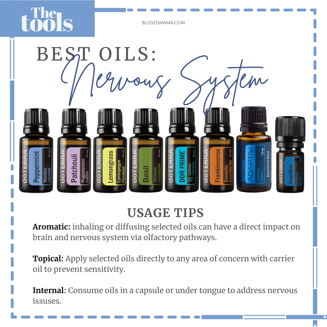 Some essential oils traditionally used to balance or calm the nervous system include Lavender, Bergamot, Cilantro, Frankincense, Roman Chamomile, Rose, Basil, Copaiba, Vetiver, and Wild Orange.