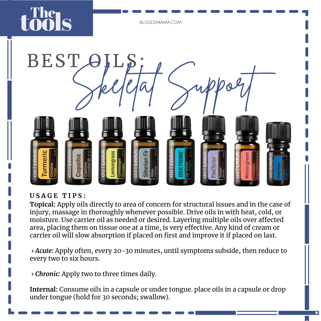 Wintergreen and Birch are good examples of oils that can be used to relieve and resolve skeletal issues. Additionally, Lemongrass supports the healing of connective tissue.