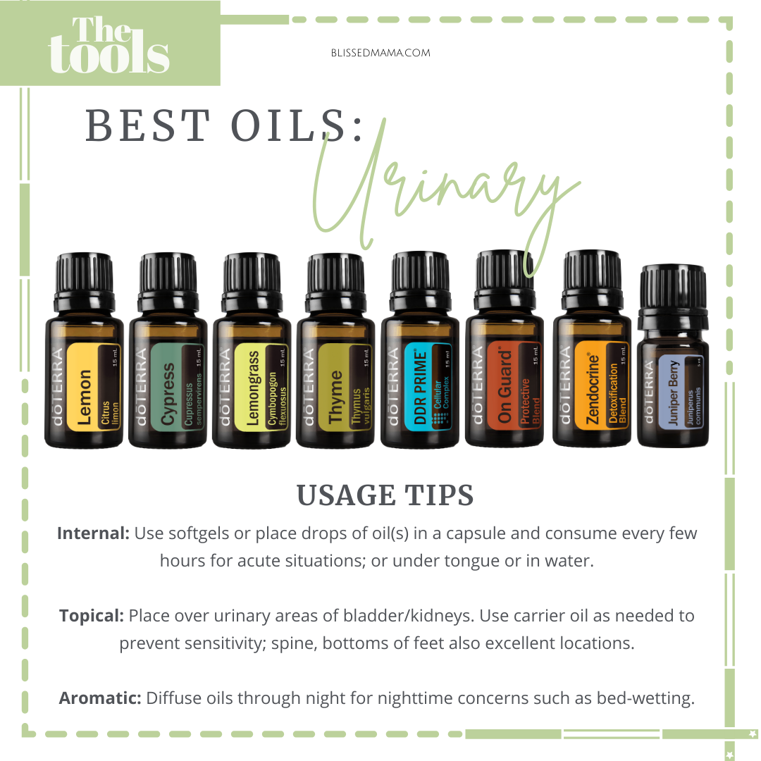 Several essential oils support the urinary system naturally. Lemon and Juniper Berry both act as diuretics. Lemongrass decongests the urinary tract and fights infection. Cypress resolves excess water/fluid retention.