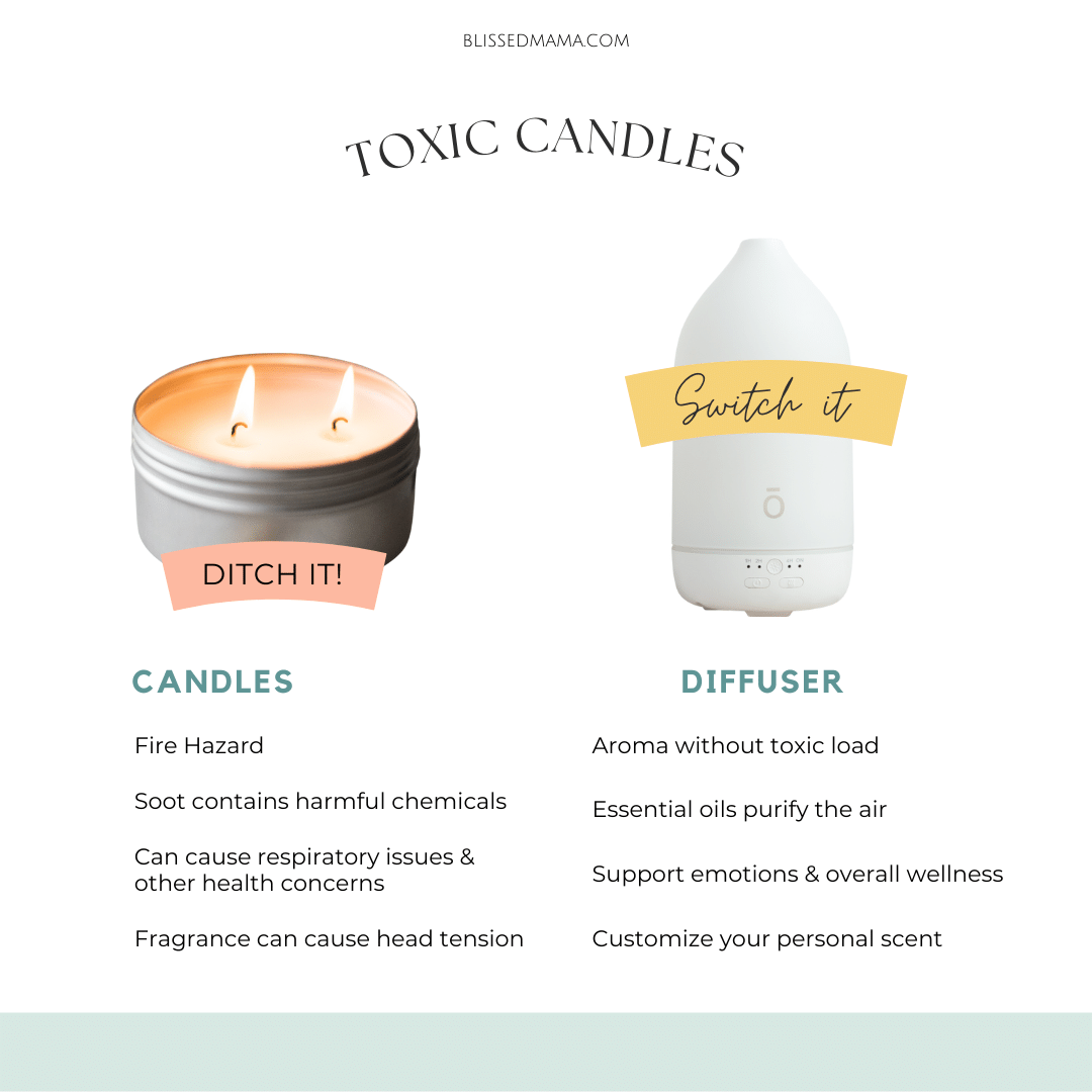 Ditch the candles and replace them with an essential oil diffuser. I know how many of us love our scented candles, especially during the fall and at Christmas time, but your candles are even more toxic than you think. Scented candles are especially toxic. Scented candles are a huge source of indoor air pollutants and they put off chemicals that are considers just as dangerous as SECOND-HAND SMOKE! Paraffin is a common ingredient in most candles. Paraffin is a petroleum waste product that needs to be deodorized and chemically bleached before it can be made into wax. Paraffin wax creates extremely toxic benzene and toluene when burned; benzene and toluene are known carcinogens. The toxins released from paraffin candles are the same as the toxins found in diesel fuel flames. Every time you light a paraffin wax candle you are doing the equivalent of burning diesel fuel flames in your house.
