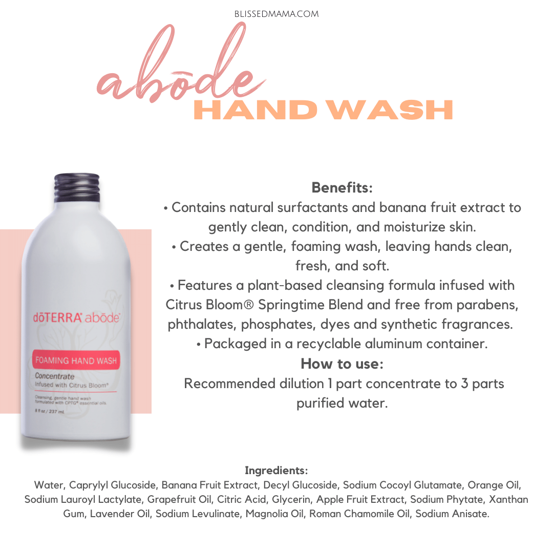 doTERRA has the Abode Hand Wash, which is a foaming hand wash and comes in Citrus Bloom Scent. Eventually doTERRA will come out with limited edition scents in the hand wash, but right now they only have the Citrus Bloom scent. This hand soap is not going to dry out your hands.