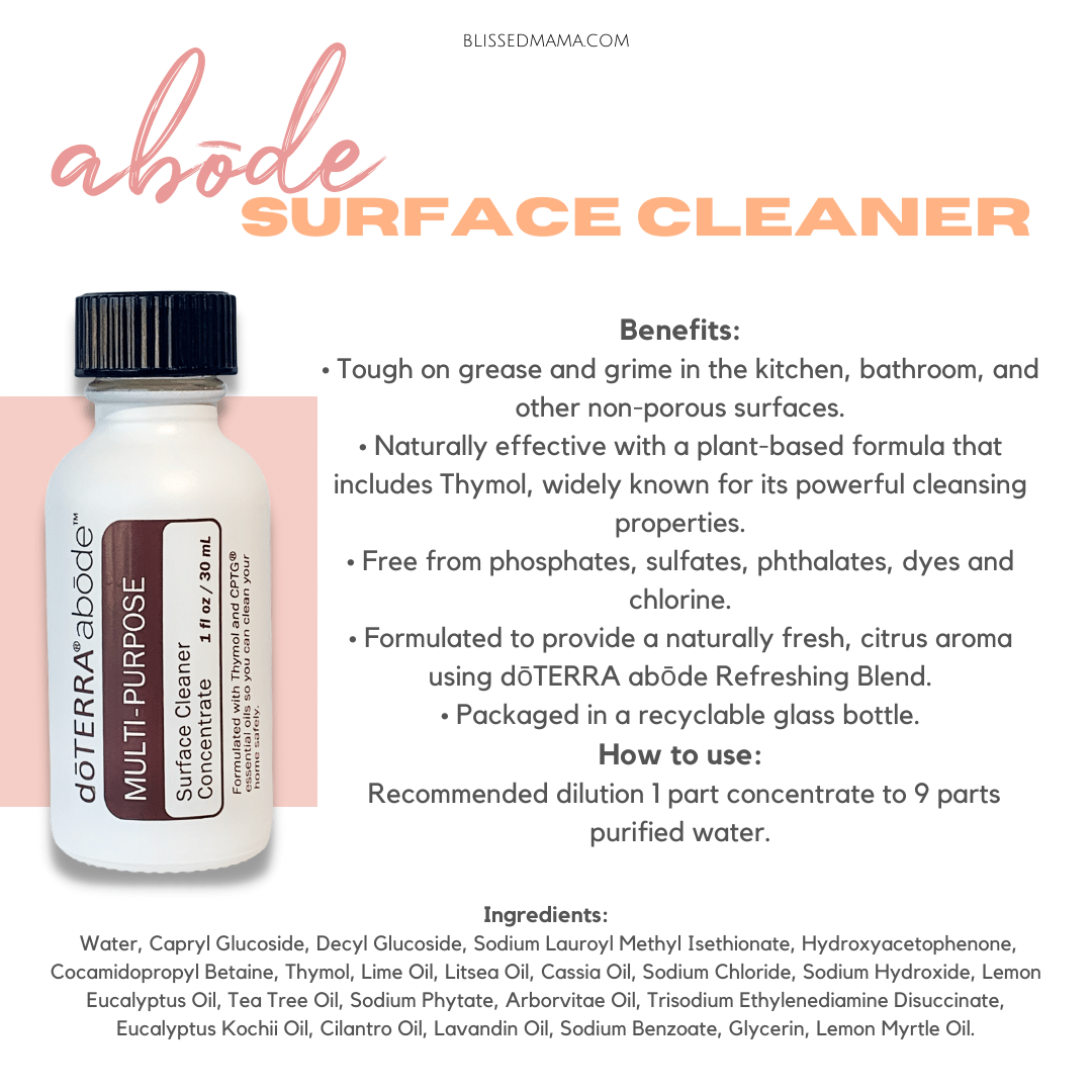 If you are not a DIY person or would just prefer a simpler option to making your own household cleaners then you must try doTERRA’s Abode line. The Abode line was designed to keep your Abode, aka your home, clean without using harsh, toxic chemicals that could negatively impact the health of your family.