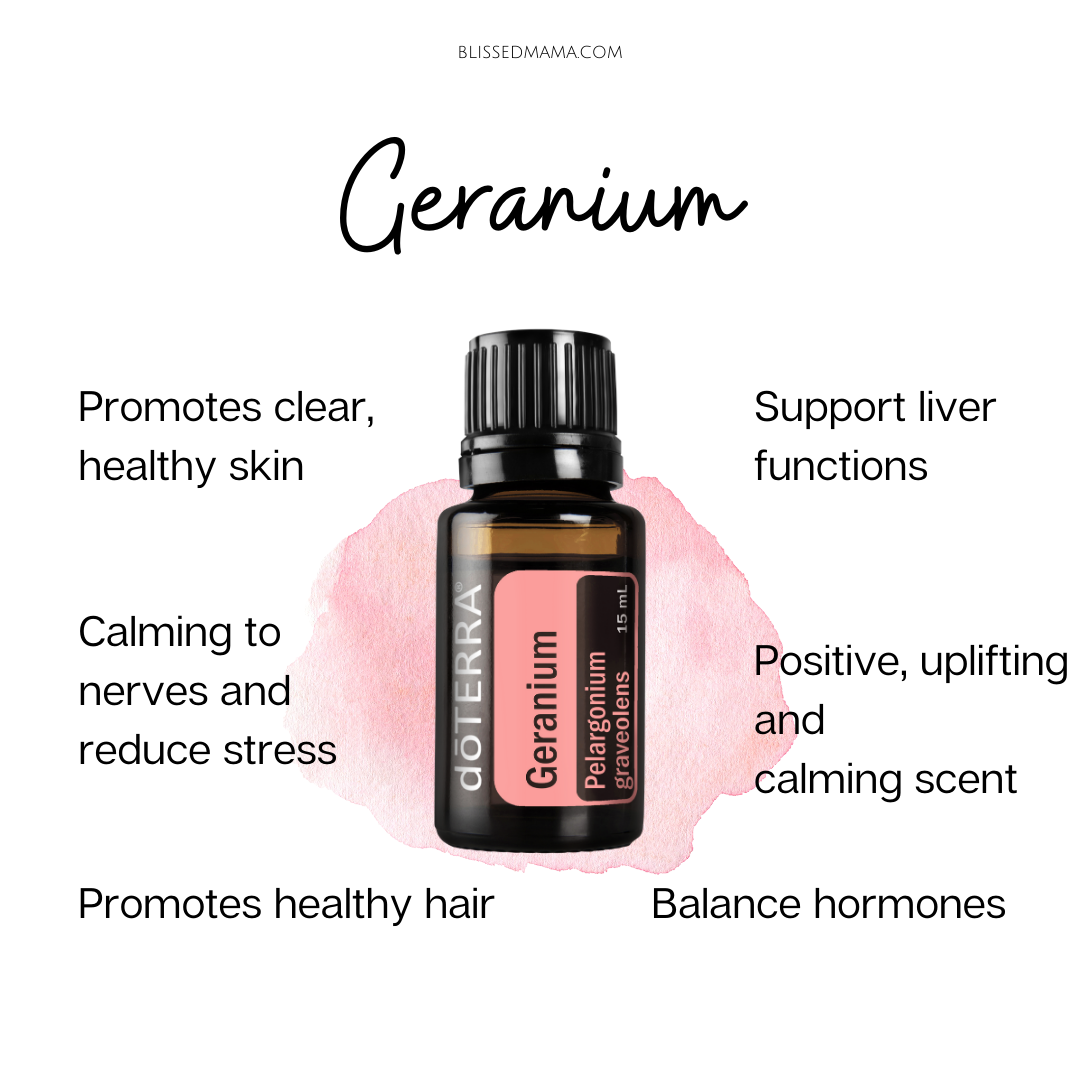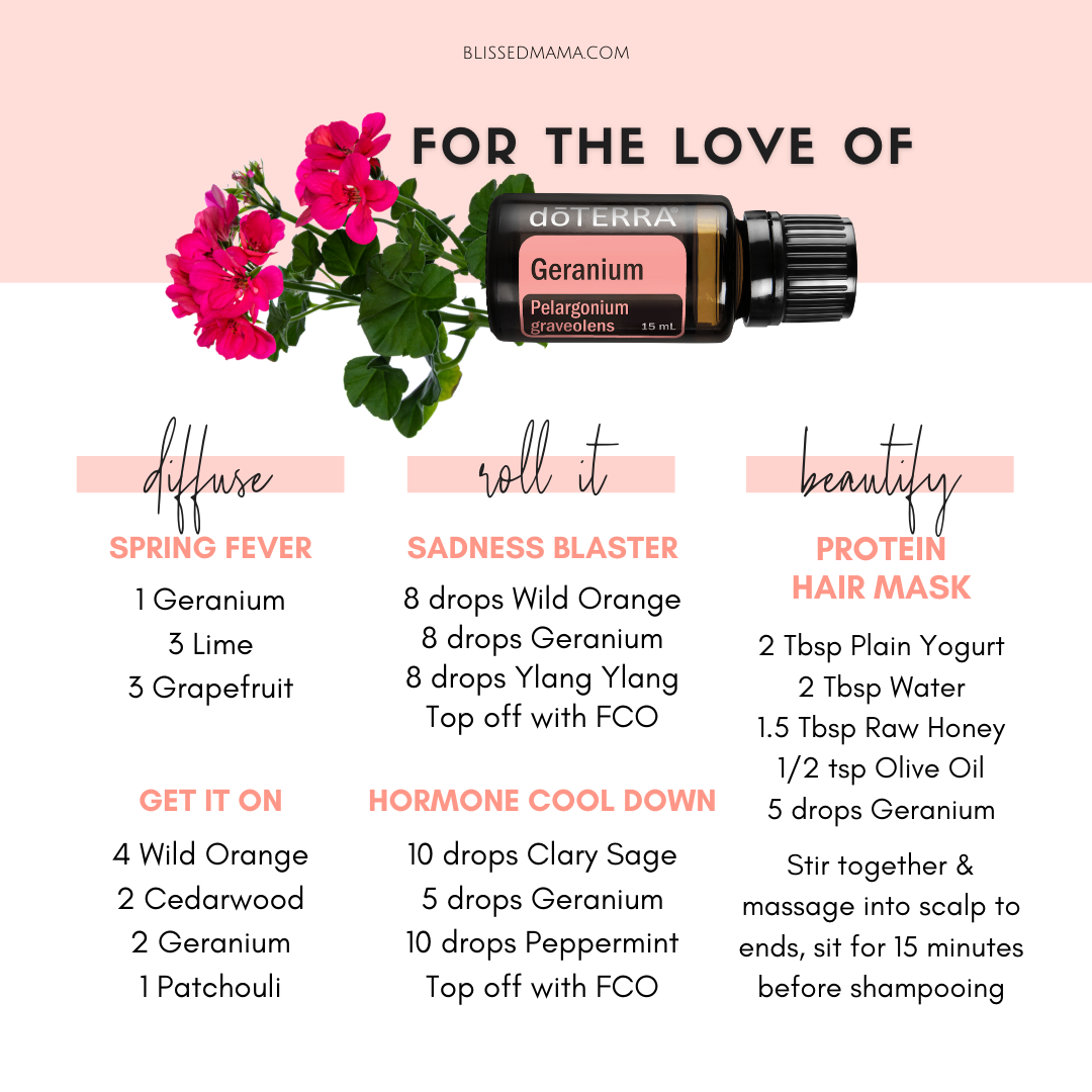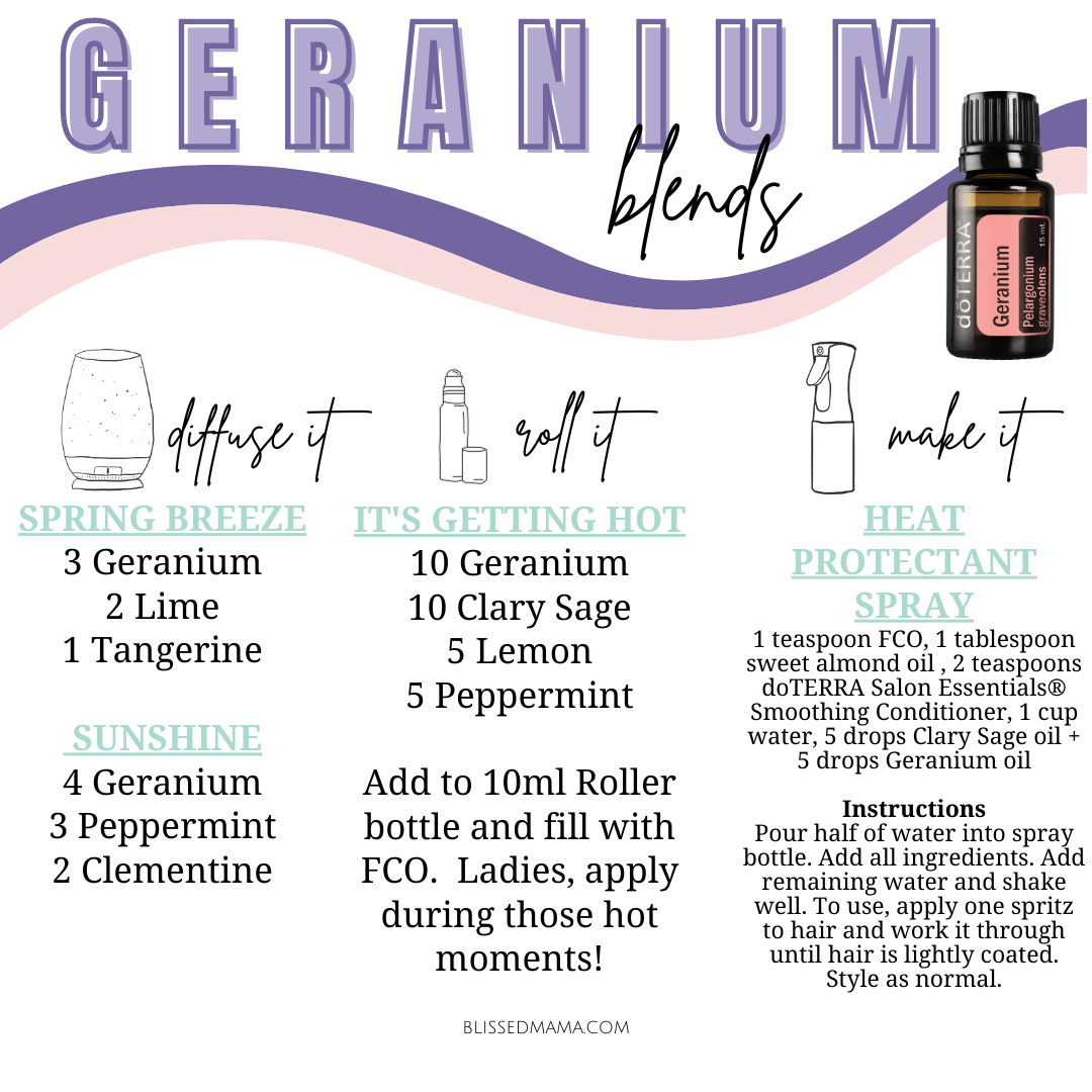 I absolutely love Geranium mixed with other oils, such as Lavender, Wild Orange, Vanilla, Citrus Bliss, Frankincense, and many others. Check out all the diffuser blend recipes below.