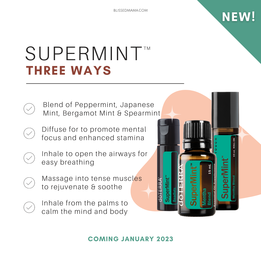 SuperMint Mentha Blend 15 mL: Peppermint, Bergamot Mint, and Spearmint essential oils combine with menthol to create this truly exhilarating blend.