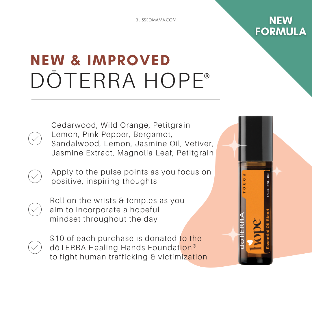 Hope oil has been reformulated to include: cedarwood, wild orange, lemon, petitgrain, pink pepper, bergamot, sandalwood, vetiver, magnolia, and jasmine. This formula smells like a perfume and will be one of my favorite perfumes to use.