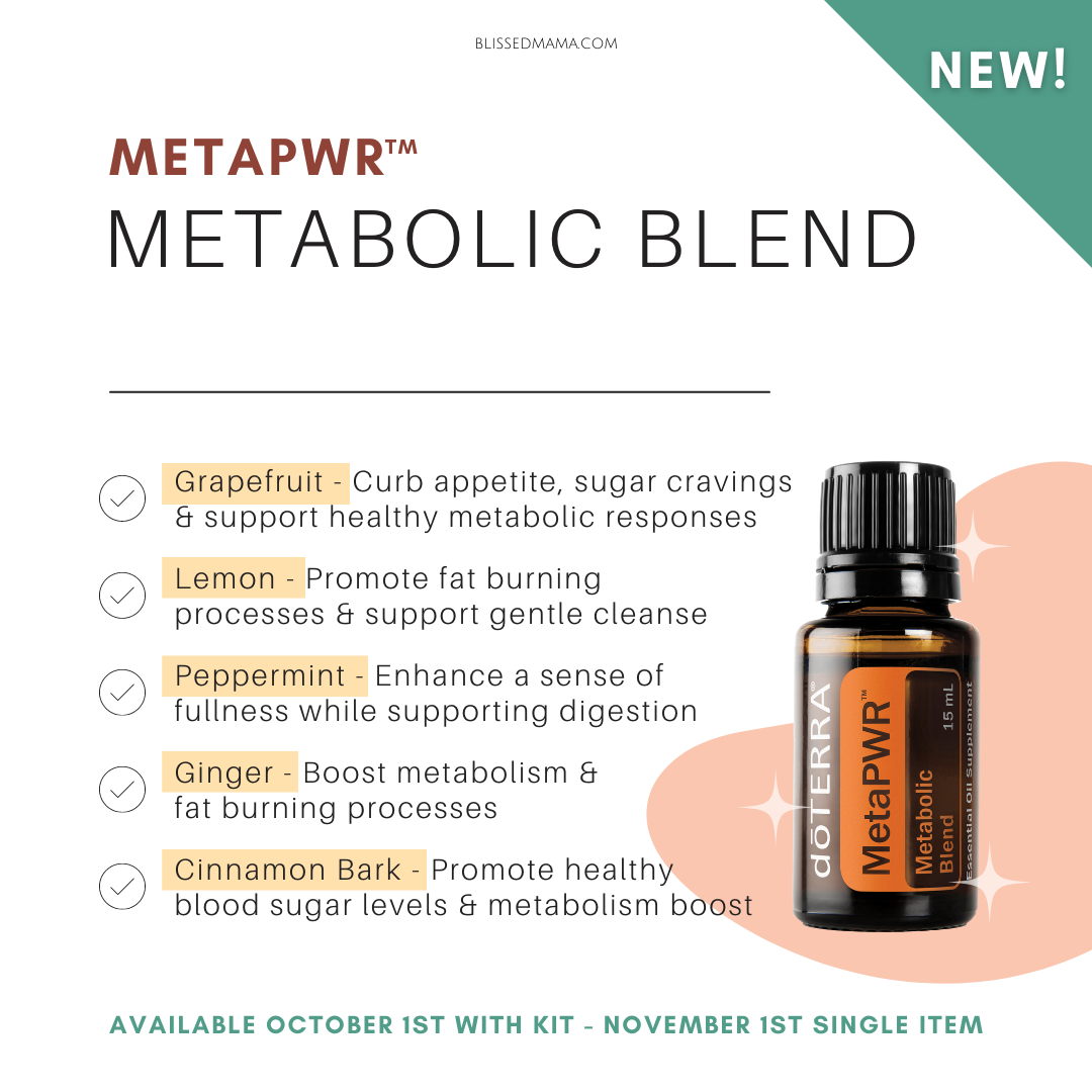 MetaPWR Metabolic Blend 15 mL: The brand-new blend brings together a perfectly balanced ratio of Grapefruit, Lemon, Peppermint, Ginger, and Cinnamon Bark essential oils to help you curb cravings and support healthy metabolic function when ingested.