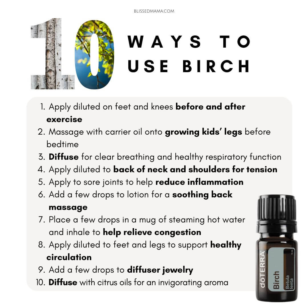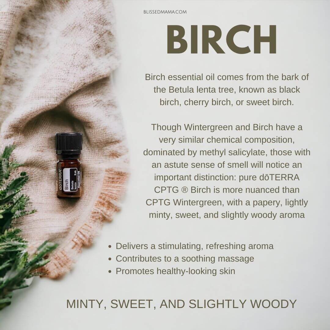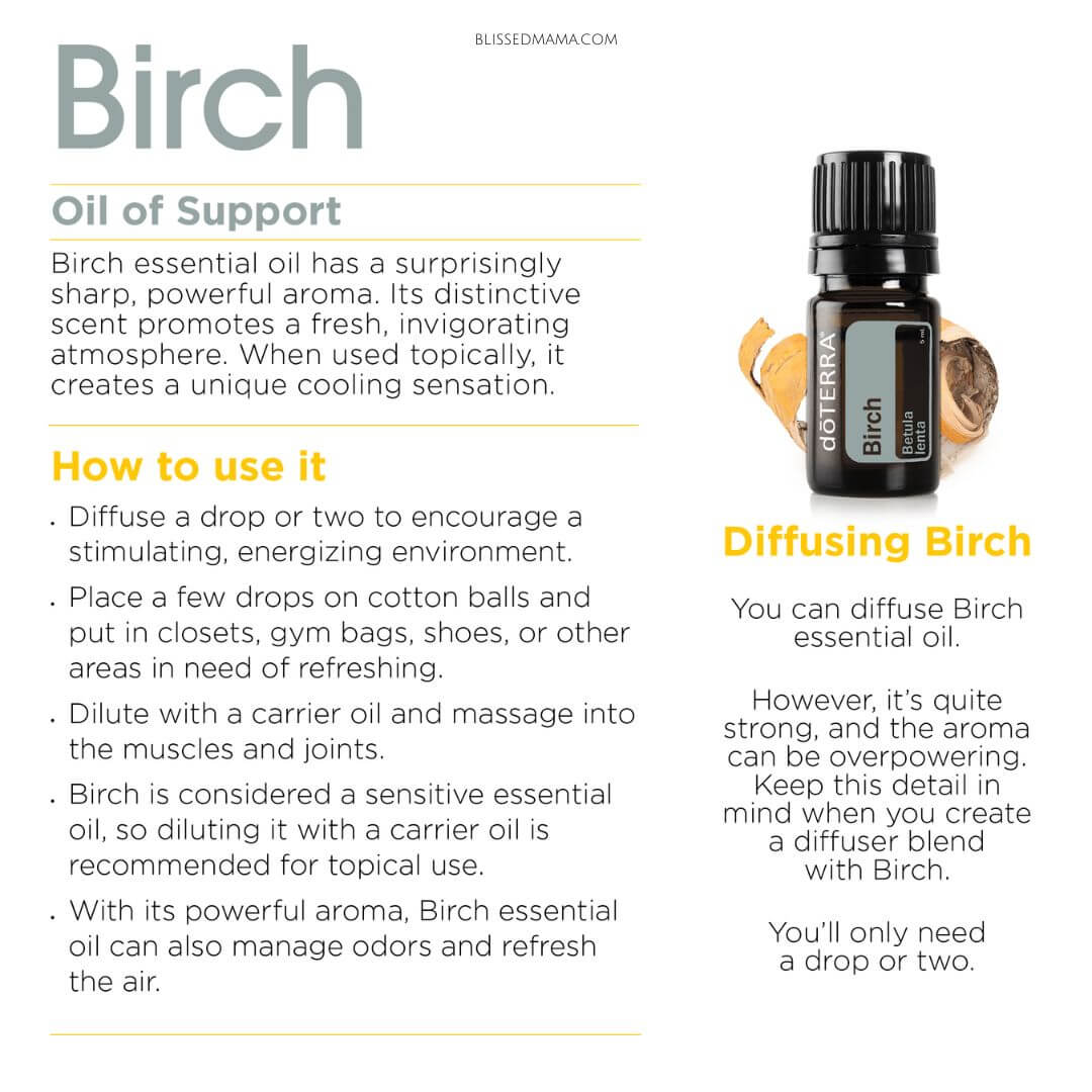 Beyond its physical benefits, birch essential oil is known as the oil of support, offering emotional solace during challenging times. You can diffuse it alone or blend it with other essential oils like peppermint, wild orange, or frankincense.
