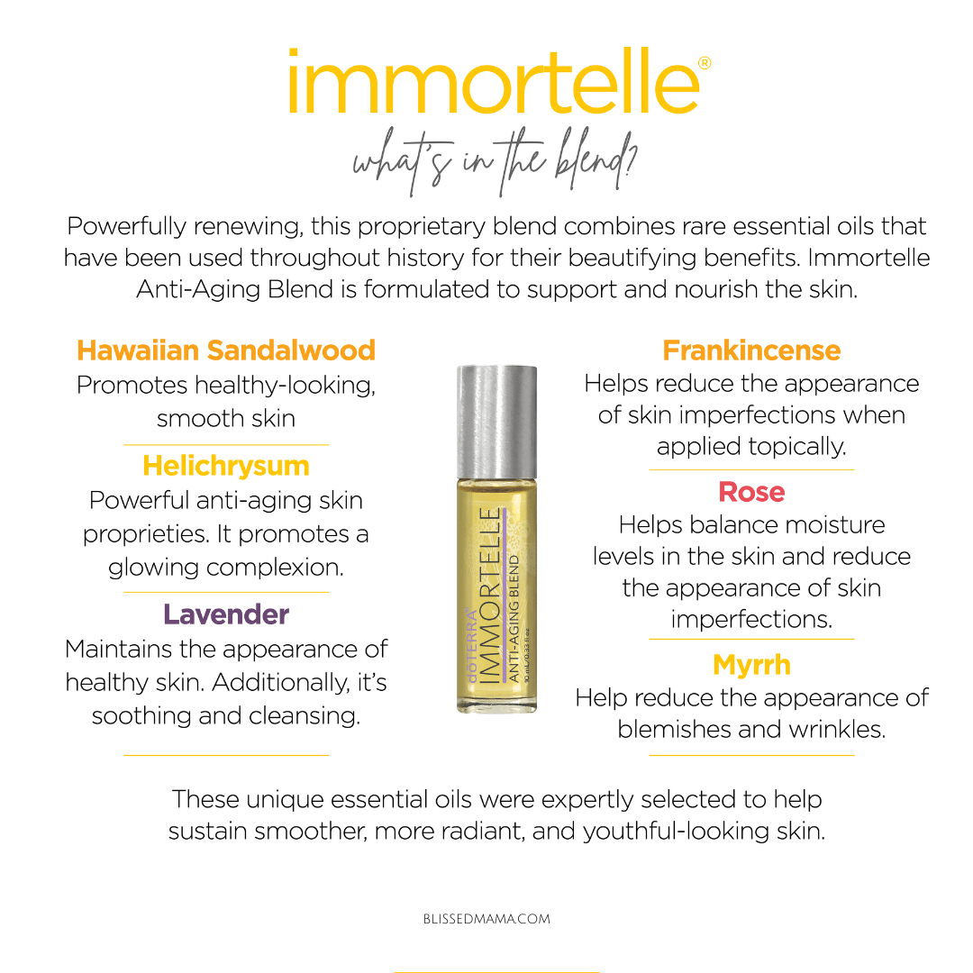 Another tip I have is to alternate between using Yarrow|POM oil and Immortelle oil. Immortelle is another popular anti-aging product from doTERRA that contains a blend of essential oils known for their powerful rejuvenating effects on the skin. This blend includes frankincense, sandalwood, lavender, myrrh, helichrysum, and rose oils.