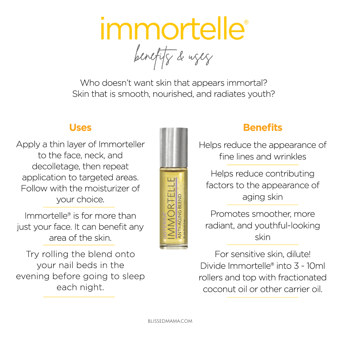 Together, these oils work synergistically to improve the overall health and appearance of the skin, reducing the appearance of fine lines and wrinkles, promoting cell regeneration, and reducing inflammation. The Immortelle blend can be used alone or in combination with other doTERRA skin care products for even greater benefits. I recommend alternating Yarrow|POM oil and Immortelle oil, use one oil in the morning and the other in the evening.