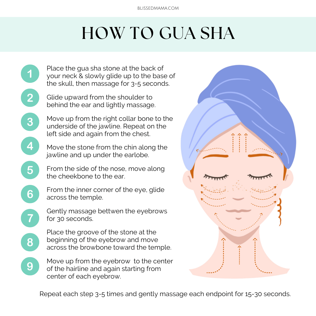 - Finish by using the Gua Sha stone to massage your neck and décolletage in an upward motion.