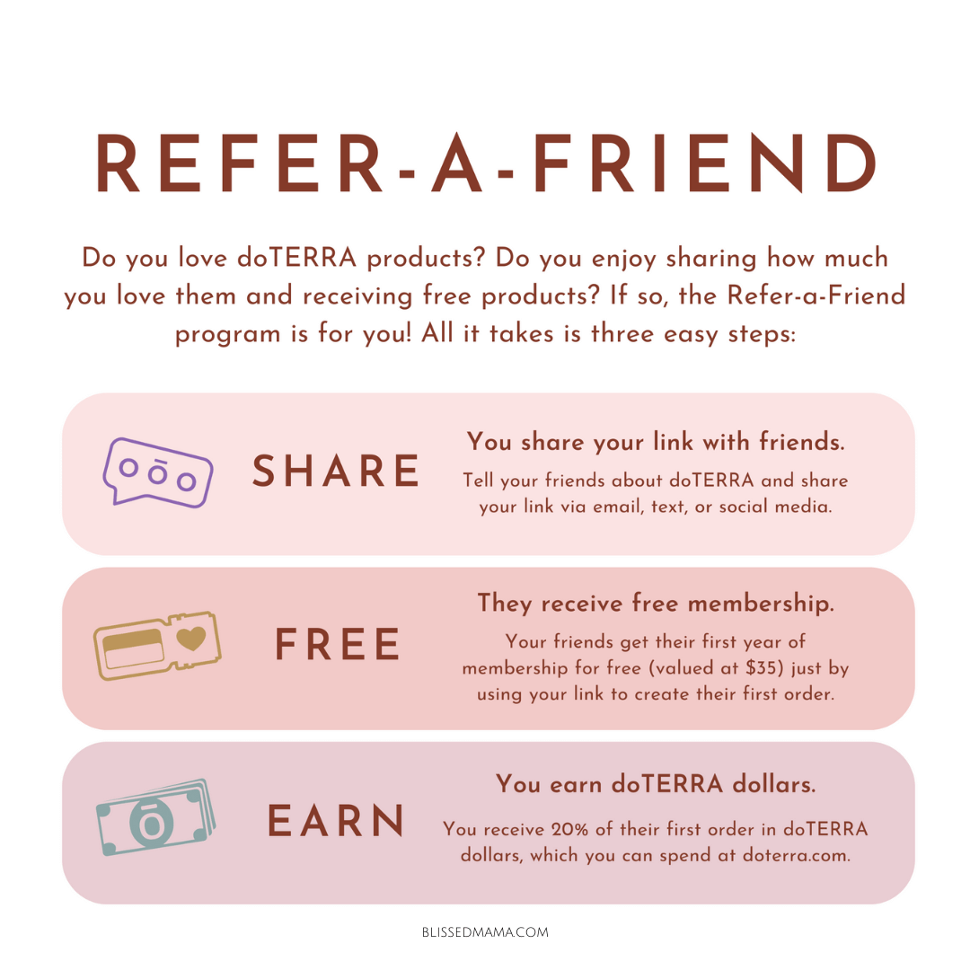 Your referrals will enjoy a free first year of doTERRA membership—valued at $35. Their membership benefits include 25% off retail prices and access to Loyalty Rewards Program (LRP) points, auto-shipped products, and free shipping on auto-shipped orders over 100 PV.