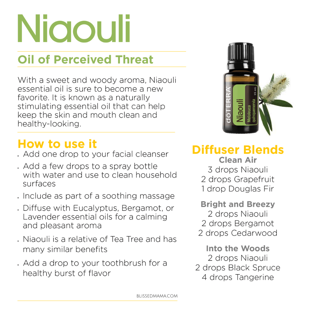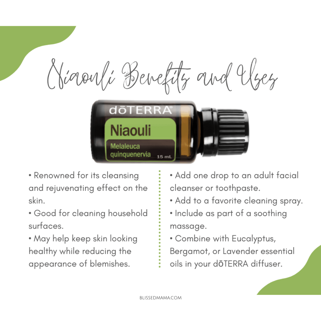 There are a few different ways to take advantage of the cleaning properties Niaouli contains. Making my own DIY cleaning products has been so beneficial to the health of my family and it saves me money. You can make an all purpose cleaner using 20 drops of Niaouli, 20 drops of Lemon in a 16oz spray bottle. Fill 1/3 of the bottle with white Vinegar and fill the rest up with water. If making your own cleaning products excites you, you can read more about it and get recipes here: