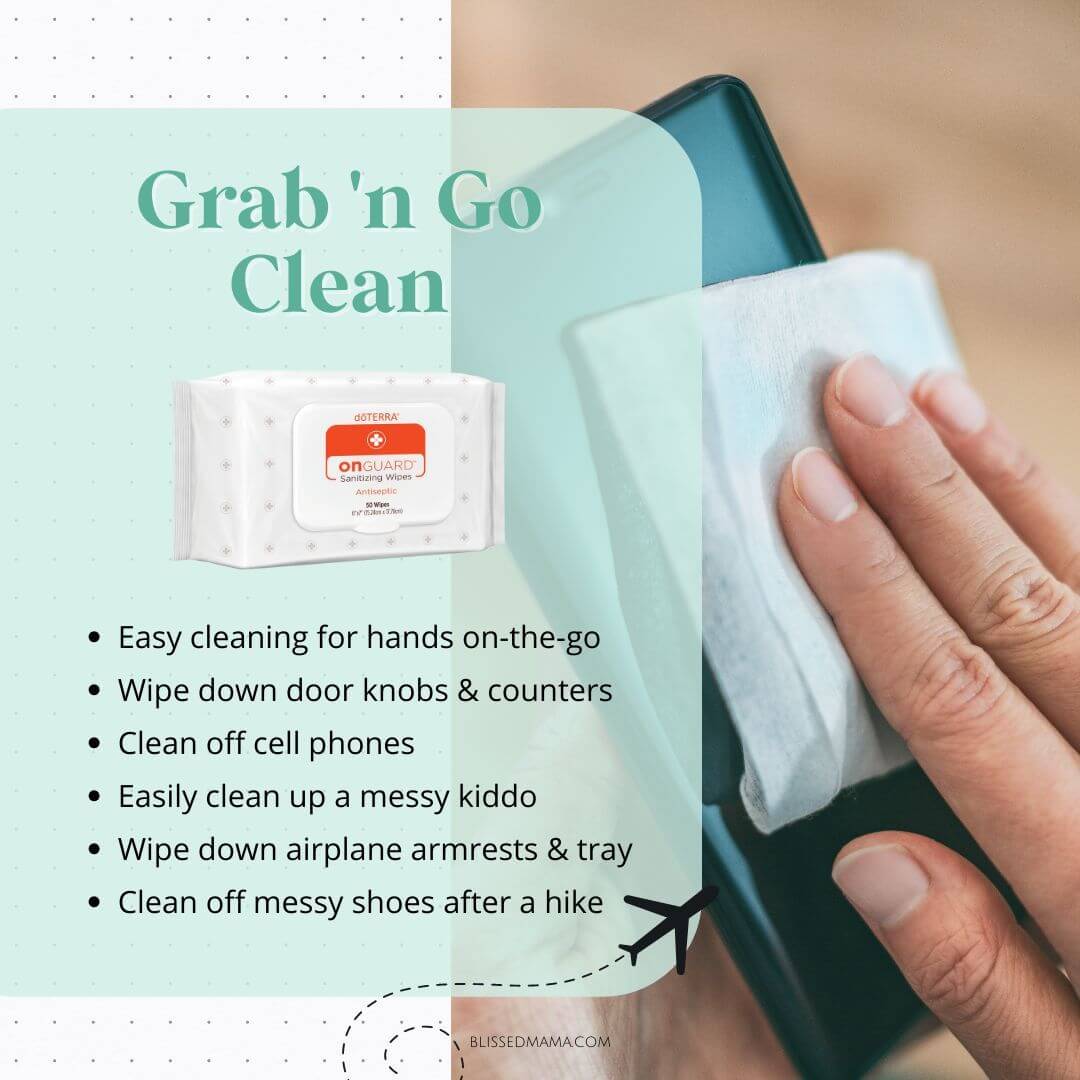 These are great for on the go. You have probably heard that the little trays that fold down in front of you on airplanes are very rarely cleaned well. I use these wipes to quickly wipe down the tray and the armrests when I get to my seat. If you don’t have the On Guard Hand Wipes, just use the On Guard Hand Sanitizer.
