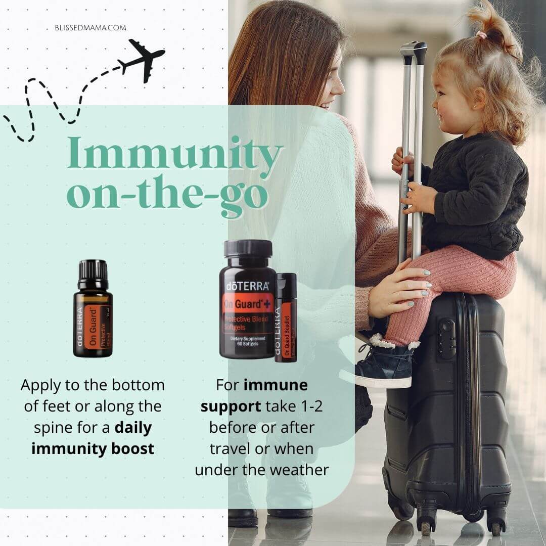 Discomfort relief is essential, especially during long trips or when dealing with muscle tension. Copaiba essential oil is known for its occasional discomfort-relieving properties. It can be applied directly to tight muscles or areas of discomfort or place a drop under your tongue – this works well for calming anxious feelings. Copaiba can also be used to support healthy skin. You can also use Deep Blue essential oil for occasional discomfort relief, but I find that Copaiba doesn’t have as much of an intense aroma, so I know I may need to use it on a plane or crowded space I will opt for Copaiba.