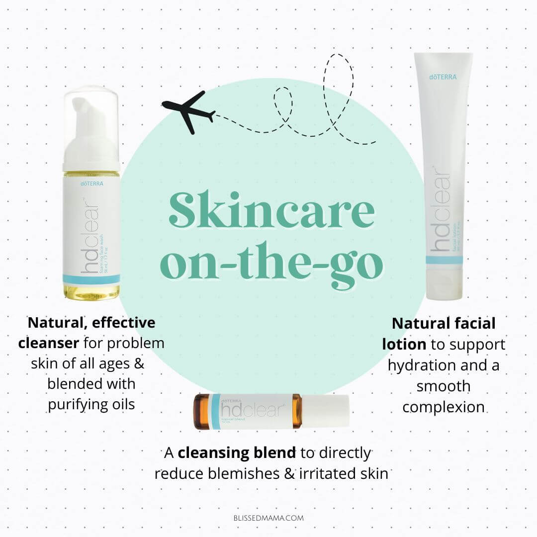 These are all my travel skin care essentials. For breakouts, I rely on the HD Clear product. I also use Yarrow Palm oil as a facial serum to keep my skin looking its best. And finally, I apply Clary Calm to my armpits every day to maintain healthy hormone levels. These are my go-to products for skincare, and they conveniently fit into my carry-on luggage. As someone who prefers traveling with just a carry-on, I've learned to streamline my packing and prioritize the essentials.