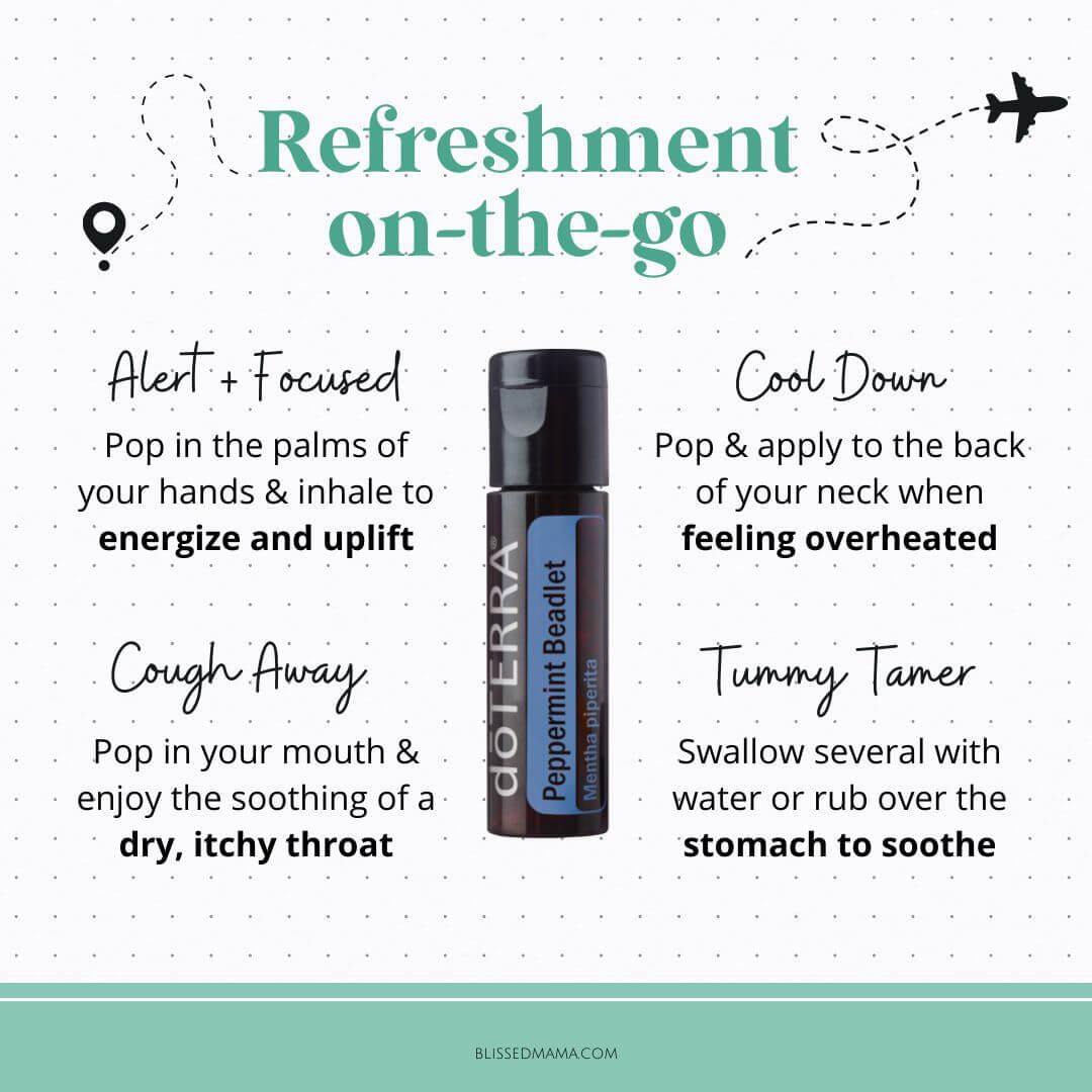 In addition to essential oils, I also carry beadlets for quick and easy use, including Metapower, On Guard, Peppermint, and Super Mint. These beadlets provide a convenient and portable solution for on-the-go support. The Peppermint Beadlets help me to wake up and freshen my breath. I also take the Peppermint Beadlets to give to my daughter when she experiences motion sickness while traveling. The On Guard Beadlets are obviously for immune support; you can never have too much On Guard. The MetaPWR Beadlets help support healthy blood sugar levels. SuperMint also helps to freshen breath and tastes really good.
